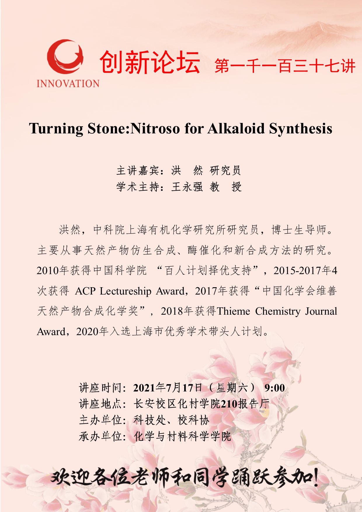 洪然 研究员 必赢3003no1线路检测中心创新论坛第一千一百三十七讲:Turning Stone:Nitroso for Alkaloid Synthesis 讲座时间 2021年7月17日(星期六) 9:00 讲座地点 长安校区化材学院210报告厅 讲座人介绍 洪然 研究员 讲座内容