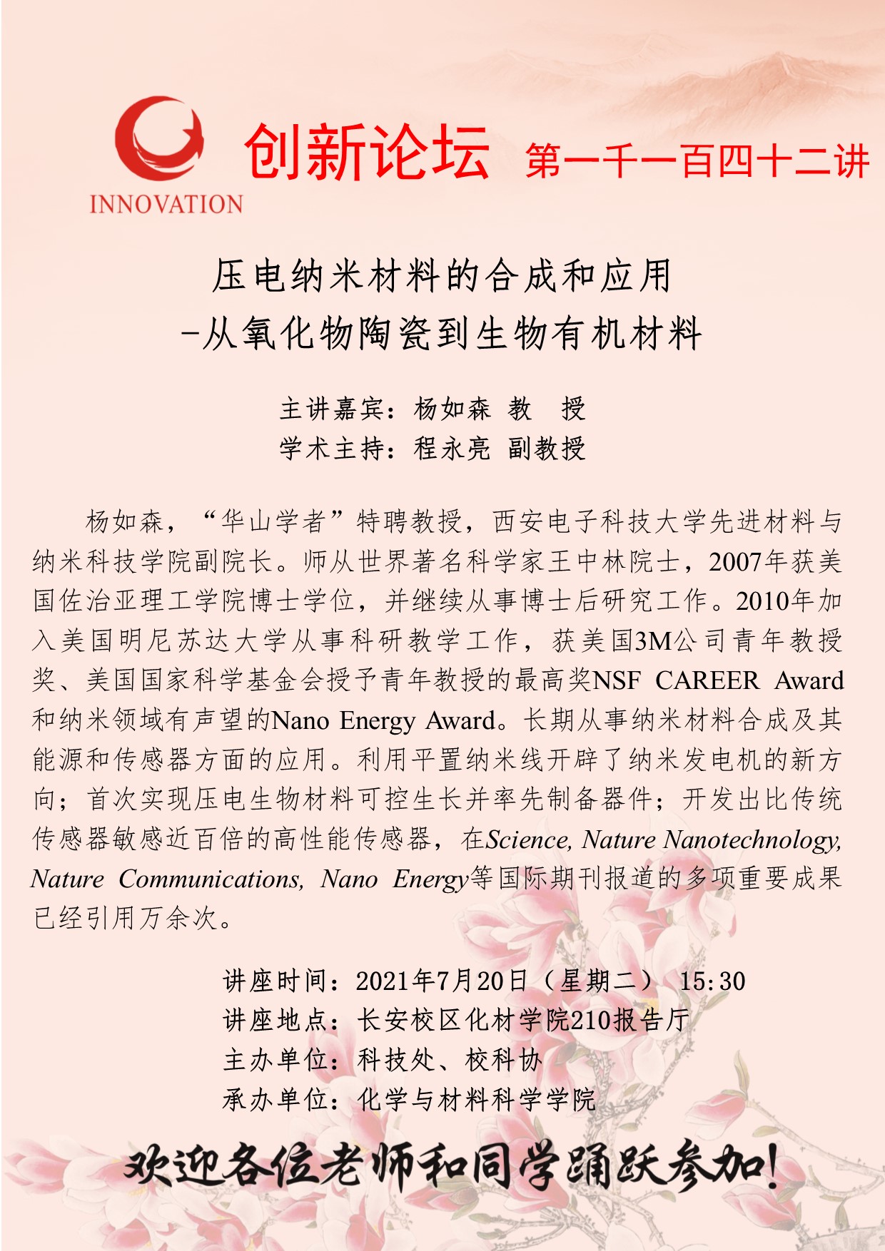 杨如森 教授 必赢3003no1线路检测中心创新论坛第一千一百四十二讲:压电纳米材料的合成和应用-从氧化物陶瓷到生物有机材料 讲座时间 2021年7月20日(星期二) 15:30 讲座地点 长安校区化材学院210报告厅 讲座人介绍 杨如森 教授 讲座内容