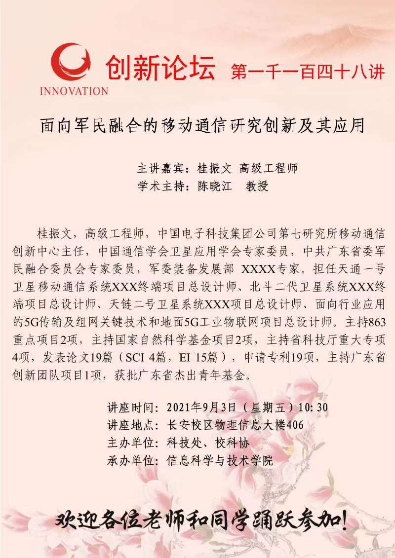 桂振文 高级工程师 必赢3003no1线路检测中心创新论坛第一千一百四十八讲:面向军民融合的移动通信研究创新及其应用 讲座时间 2021年9月3日(星期五)10:30 讲座地点 长安校区物理信息大楼406 讲座人介绍 桂振文 高级工程师 讲座内容