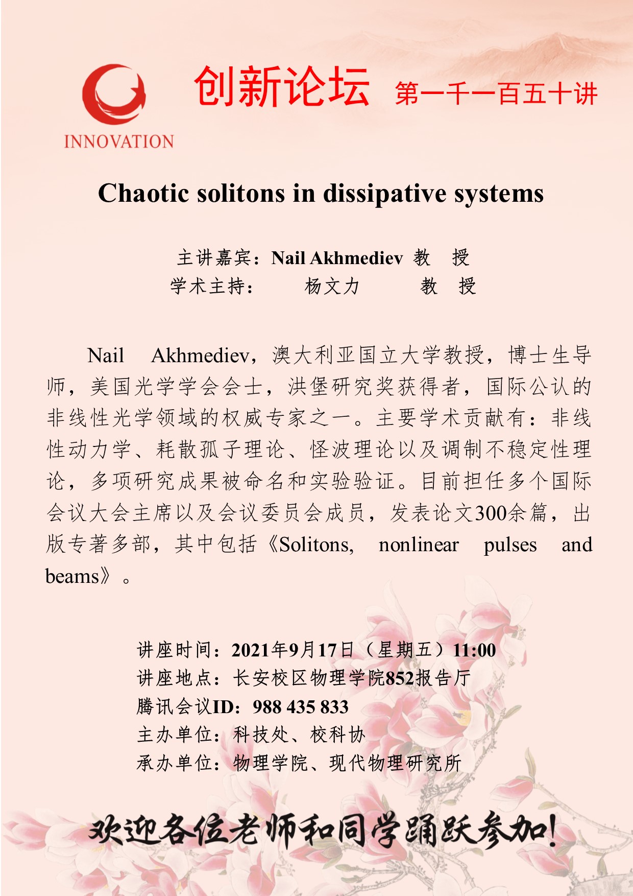 Nail Akhmediev 教授 必赢3003no1线路检测中心创新论坛第一千一百五十讲:Chaotic solitons in dissipative systems 讲座时间 2021年9月17日(星期五)11:00 讲座地点 长安校区物理学院852报告厅 讲座人介绍 Nail Akhmediev 教授 讲座内容