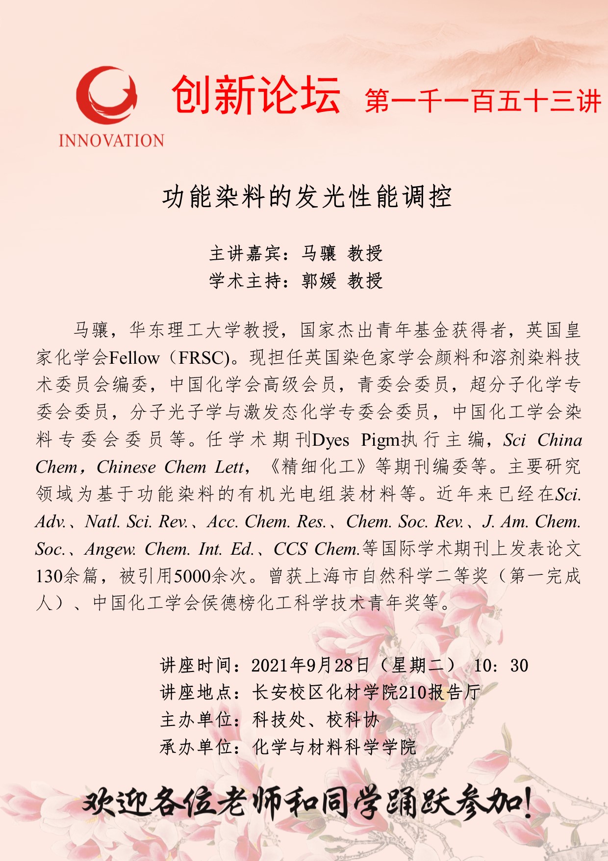 马骧 教授 必赢3003no1线路检测中心创新论坛第一千一百五十三讲:功能染料的发光性能调控 讲座时间 2021年9月28日(星期二) 10: 30 讲座地点 长安校区化材院学院210报告厅 讲座人介绍 马骧 教授 讲座内容