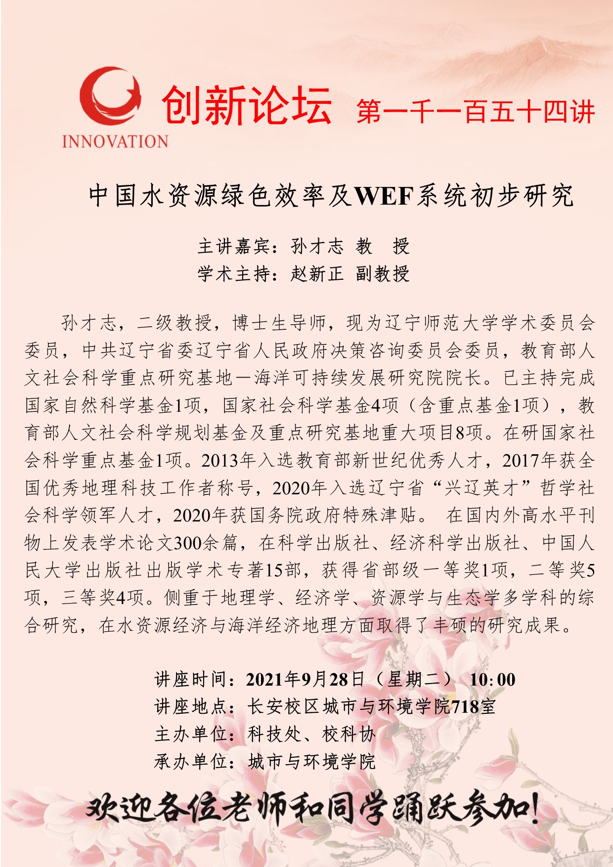 孙才志 教授 必赢3003no1线路检测中心创新论坛第一千一百五十四讲:中国水资源绿色效率及WEF系统初步研究 讲座时间 2021年9月28日(星期二) 10:00 讲座地点 长安校区城市与环境学院718室 讲座人介绍 孙才志 教授 讲座内容