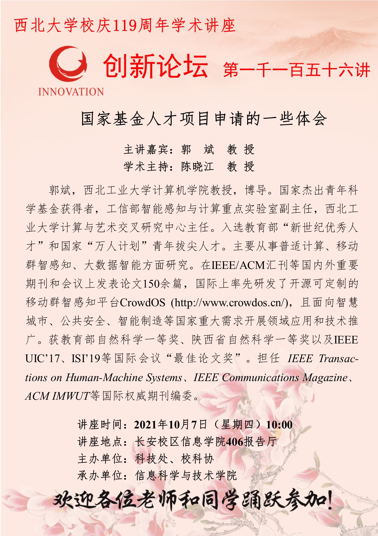 郭斌 教授 必赢3003no1线路检测中心创新论坛第一千一百五十六讲暨校庆119周年学术讲座: 国家基金人才项目申请的一些体会 讲座时间 2021年10月7日(星期四)10:00 讲座地点 长安校区信息学院406报告厅 讲座人介绍 郭斌 教授 讲座内容