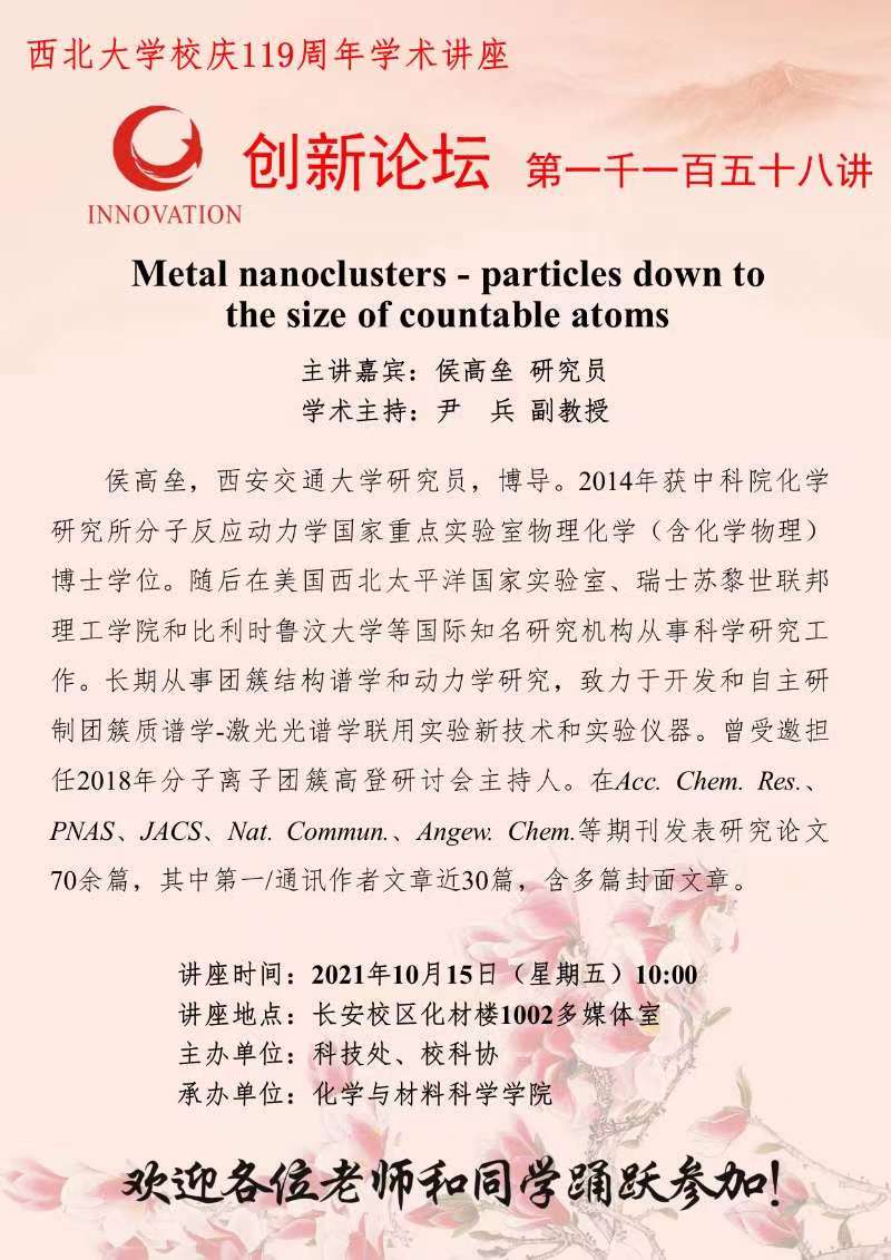 侯高垒 研究员 必赢3003no1线路检测中心创新论坛第一千一百五十八讲暨校庆119周年学术讲座: Metal nanoclusters - particles down to the size of countable atoms 讲座时间 2021年10月15日(星期五)10:00 讲座地点 长安校区化材楼1002多媒体室 讲座人介绍 侯高垒 研究员 讲座内容