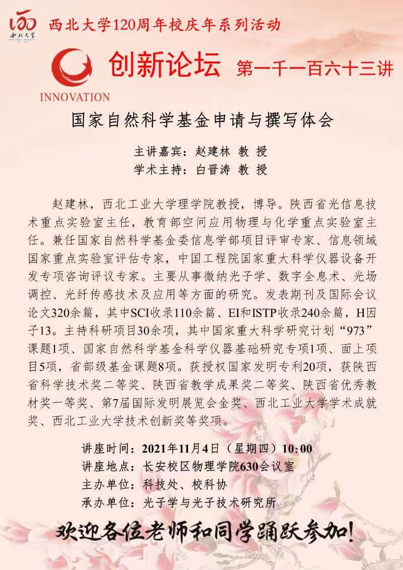 赵建林 教授 必赢3003no1线路检测中心创新论坛第一千一百六十三讲暨120周年校庆年系列活动:国家自然科学基金申请与撰写体会 讲座时间 2021年11月4日(星期四)10:00 讲座地点 长安校区物理学院630会议室 讲座人介绍 赵建林 教授 讲座内容