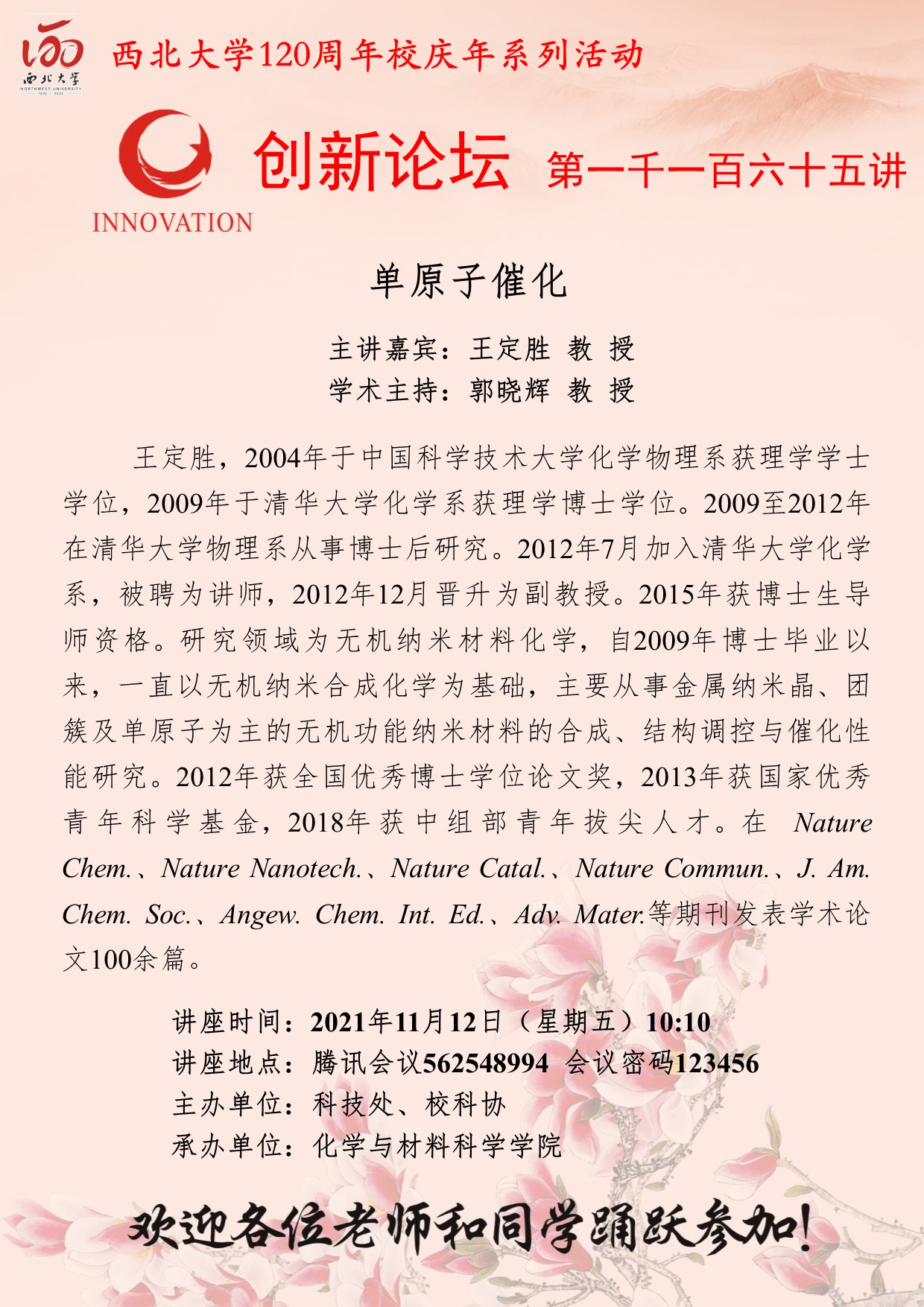 王定胜 教授 必赢3003no1线路检测中心创新论坛第一千一百六十五讲暨120周年校庆年系列活动:单原子催化 讲座时间 2021年11月12日(星期五)10:10 讲座地点 腾讯会议562548994 会议密码123456 讲座人介绍 王定胜 教授 讲座内容