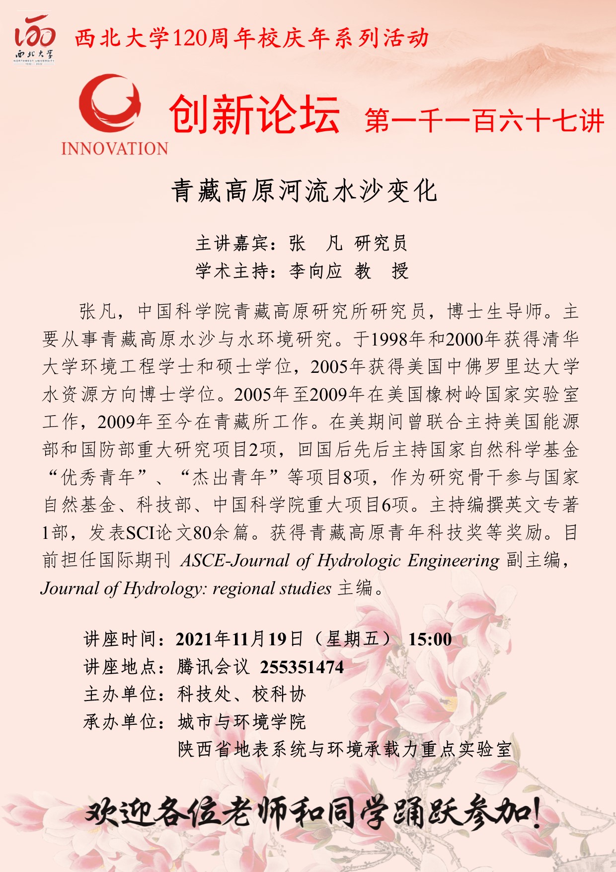 张凡 研究员 必赢3003no1线路检测中心创新论坛第一千一百六十七讲暨120周年校庆年系列活动:青藏高原河流水沙变化 讲座时间 2021年11月19日(星期五) 15:00 讲座地点 腾讯会议 255351474 讲座人介绍 张凡 研究员 讲座内容