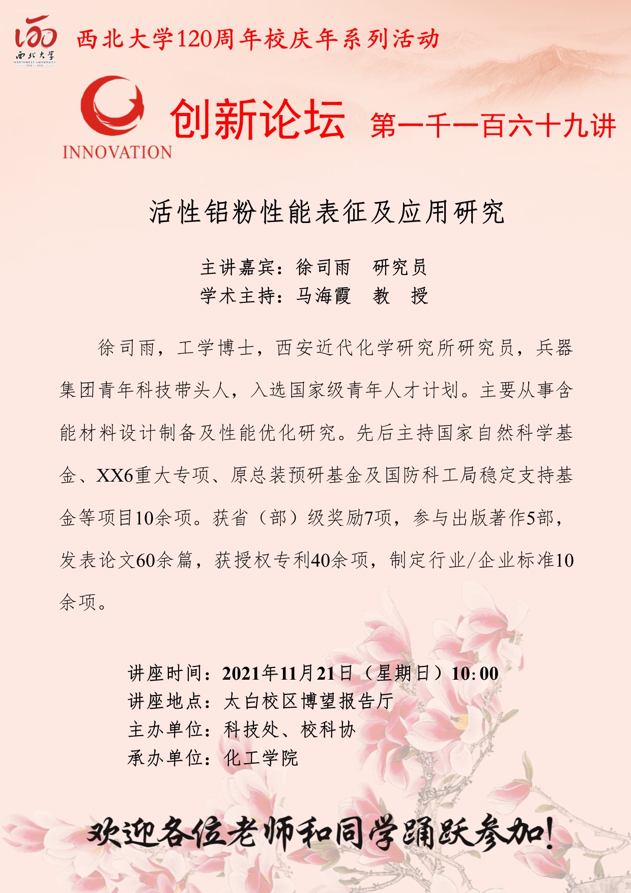 徐司雨 研究员 必赢3003no1线路检测中心创新论坛第一千一百六十九讲暨120周年校庆年系列活动:活性铝粉性能表征及应用研究 讲座时间 2021年11月21日(星期日)10:00 讲座地点 太白校区博望报告厅 讲座人介绍 徐司雨 研究员 讲座内容