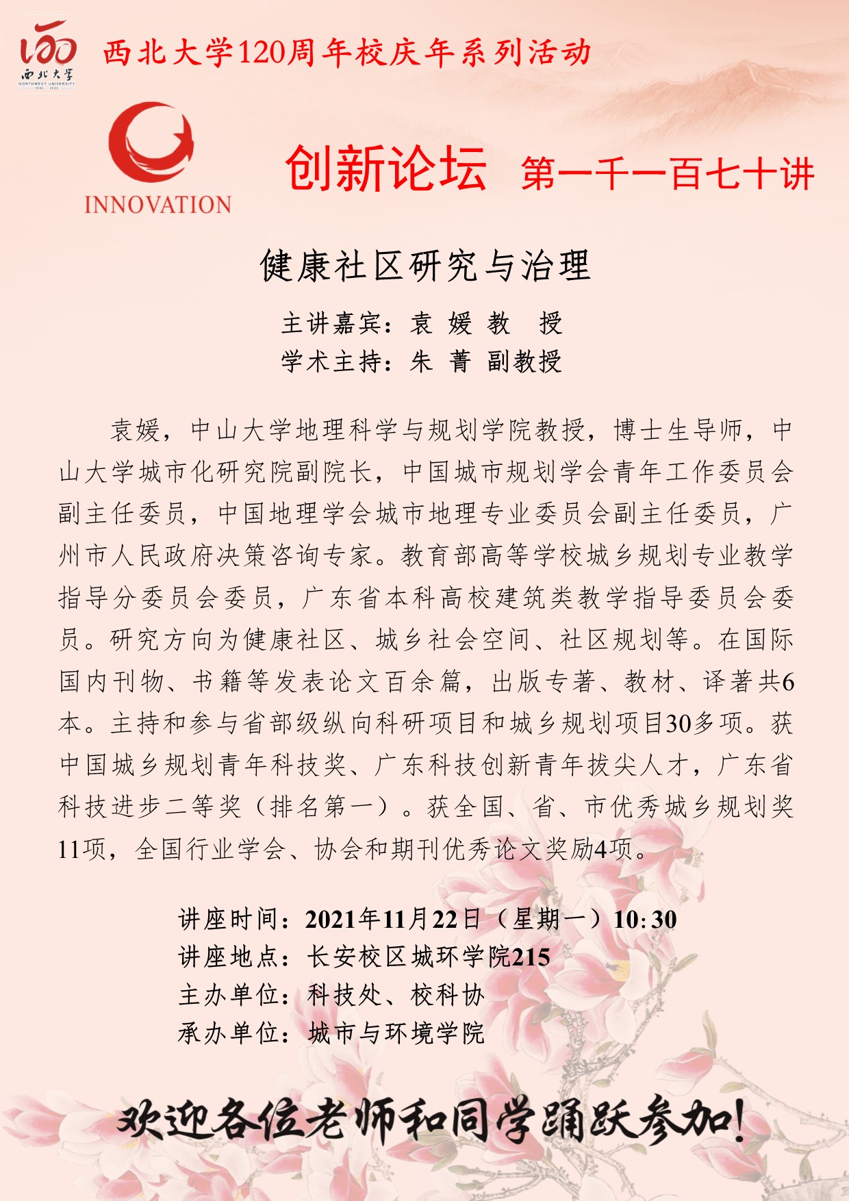 袁媛 教授 必赢3003no1线路检测中心创新论坛第一千一百七十讲暨120周年校庆年系列活动:健康社区研究与治理 讲座时间 2021年11月22日(星期一)10:30 讲座地点 长安校区城环学院215 讲座人介绍 袁媛 教授 讲座内容