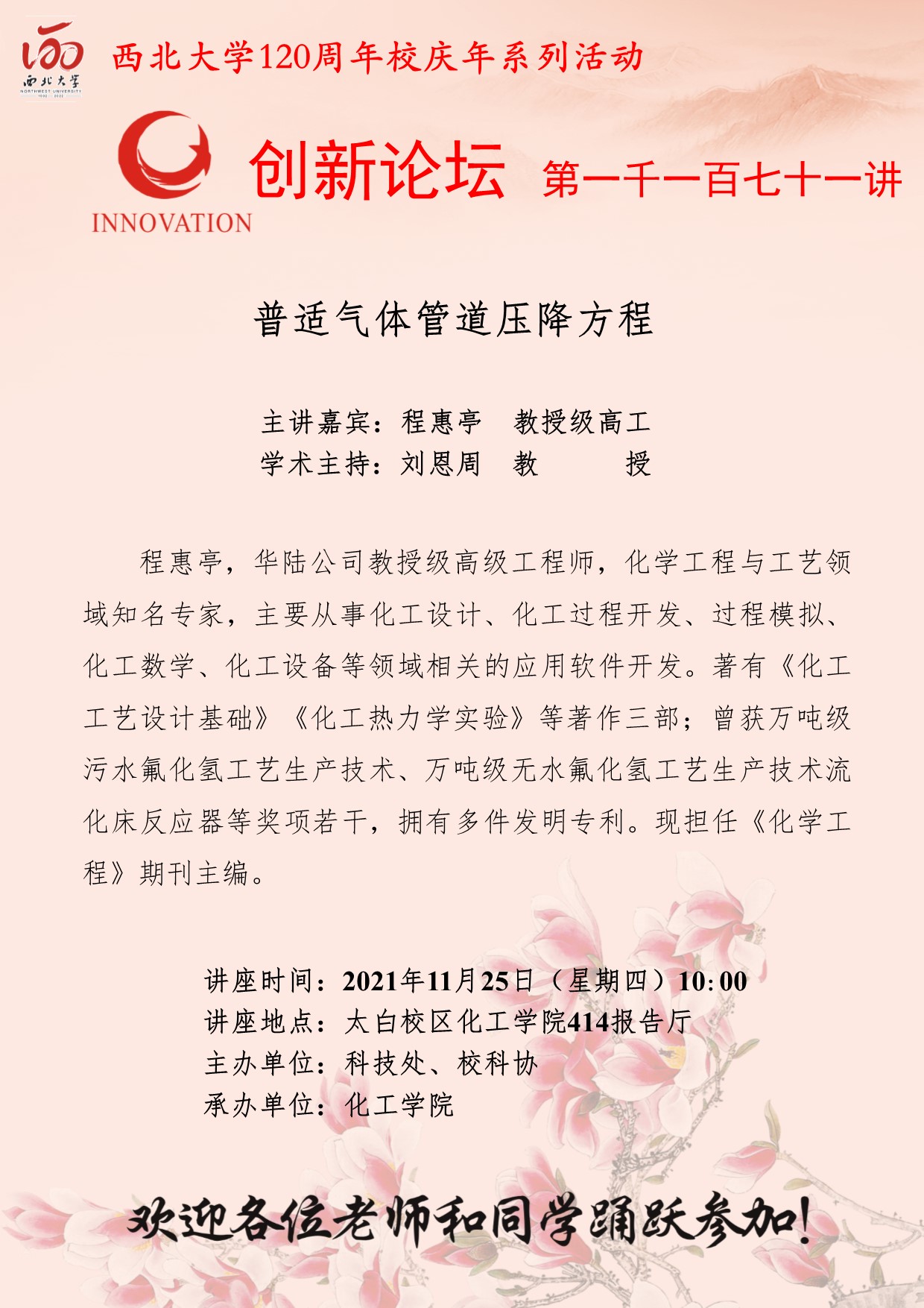 程惠亭 教授级高工 必赢3003no1线路检测中心创新论坛第一千一百七十一讲暨120周年校庆年系列活动:普适气体管道压降方程 讲座时间 2021年11月25日(星期四)10:00 讲座地点 太白校区化工学院414报告厅 讲座人介绍 程惠亭 教授级高工 讲座内容