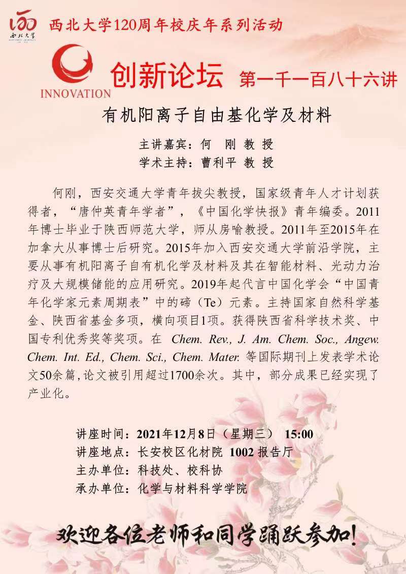 何刚 教授 必赢3003no1线路检测中心创新论坛第一千一百八十六讲暨120周年校庆年系列活动:有机阳离子自由基化学及材料 讲座时间 2021年12月8日(星期三) 15:00 讲座地点 长安校区化材院1002报告厅 讲座人介绍 何刚 教授 讲座内容