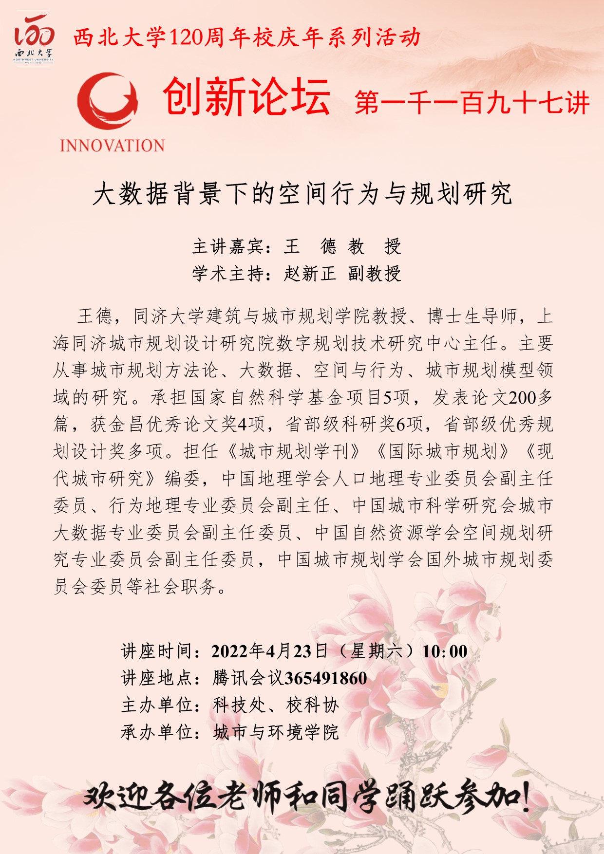 王德 教授 必赢3003no1线路检测中心创新论坛第一千一百九十七讲暨120周年校庆年系列活动:大数据背景下的空间行为与规划研究 讲座时间 2022年4月23日(星期六)10:00 讲座地点 腾讯会议:365491860 讲座人介绍 王德 教授 讲座内容