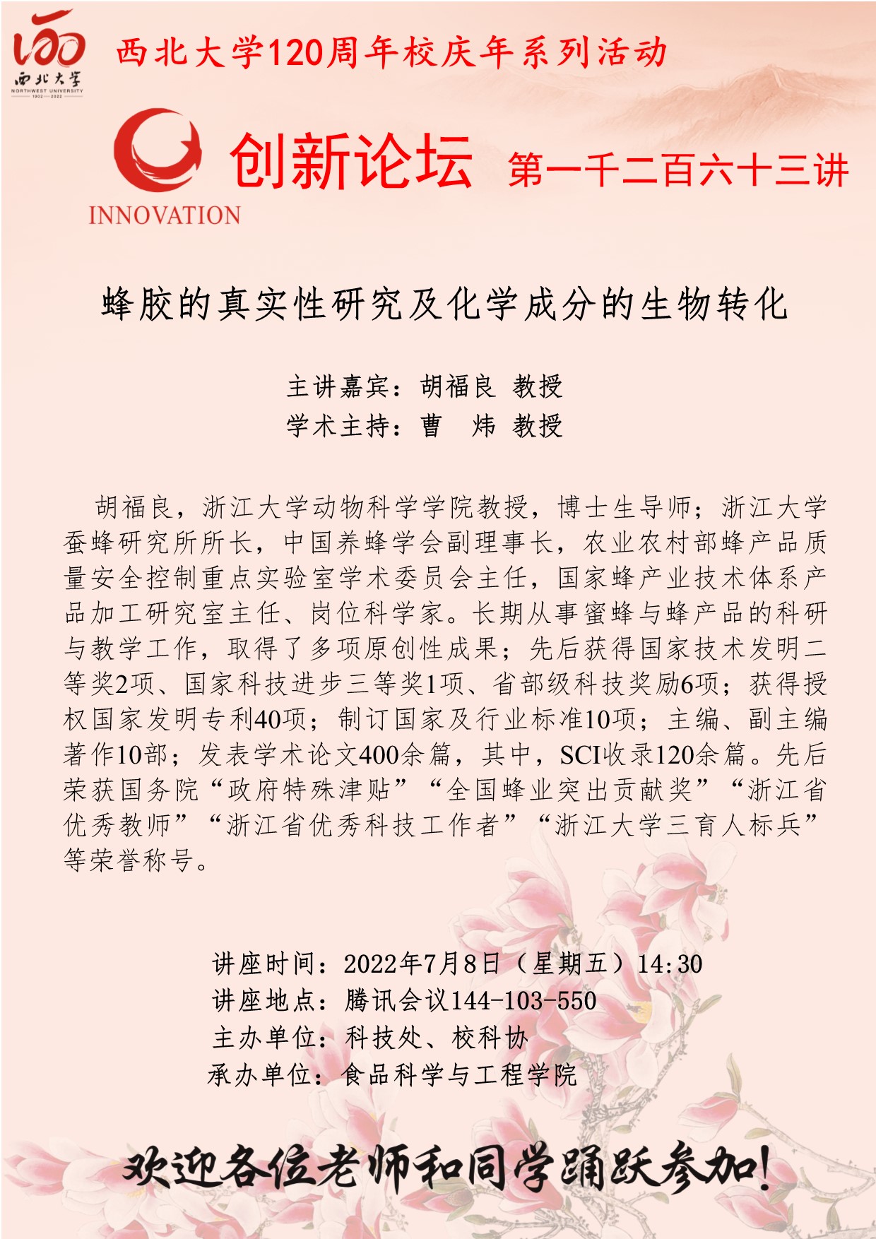 胡福良 教授 必赢3003no1线路检测中心创新论坛第一千二百六十三讲暨120周年校庆年系列活动:蜂胶的真实性研究及化学成分的生物转化 讲座时间 2022年7月8日(星期五)14:30 讲座地点 腾讯会议144-103-550 讲座人介绍 胡福良 教授 讲座内容