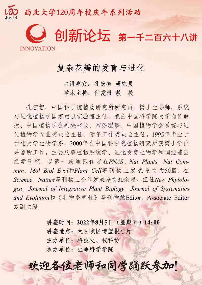 孔宏智 研究员 必赢3003no1线路检测中心创新论坛第一千二百六十八讲暨120周年校庆年系列活动:复杂花瓣的发育与进化 讲座时间 2022年8月5日(星期五)14:00 讲座地点 太白校区博望报告厅 讲座人介绍 孔宏智 研究员 讲座内容