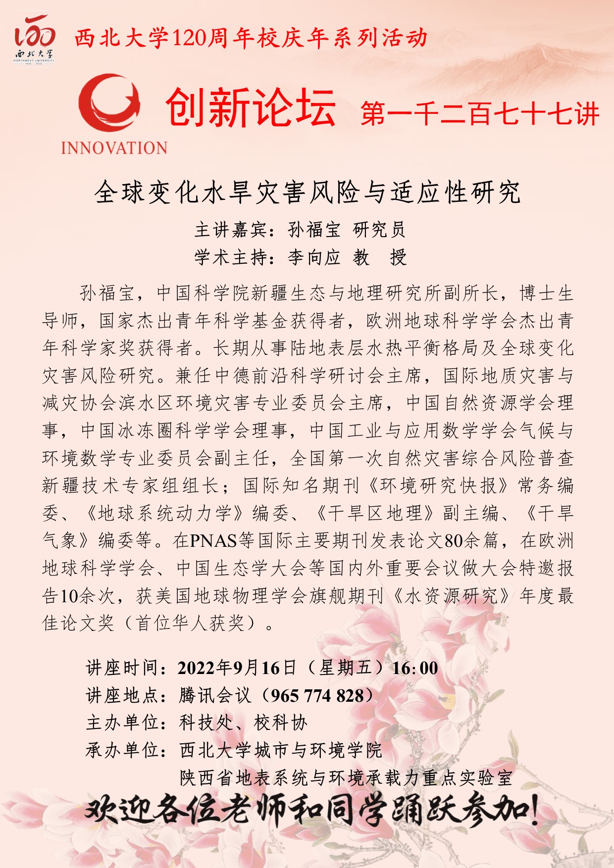 孙福宝 研究员 必赢3003no1线路检测中心创新论坛第一千二百七十七讲暨120周年校庆年系列活动:全球变化水旱灾害风险与适应性研究 讲座时间 2022年9月16日(星期五)16:00 讲座地点 腾讯会议(965 774 828) 讲座人介绍 孙福宝 研究员 讲座内容