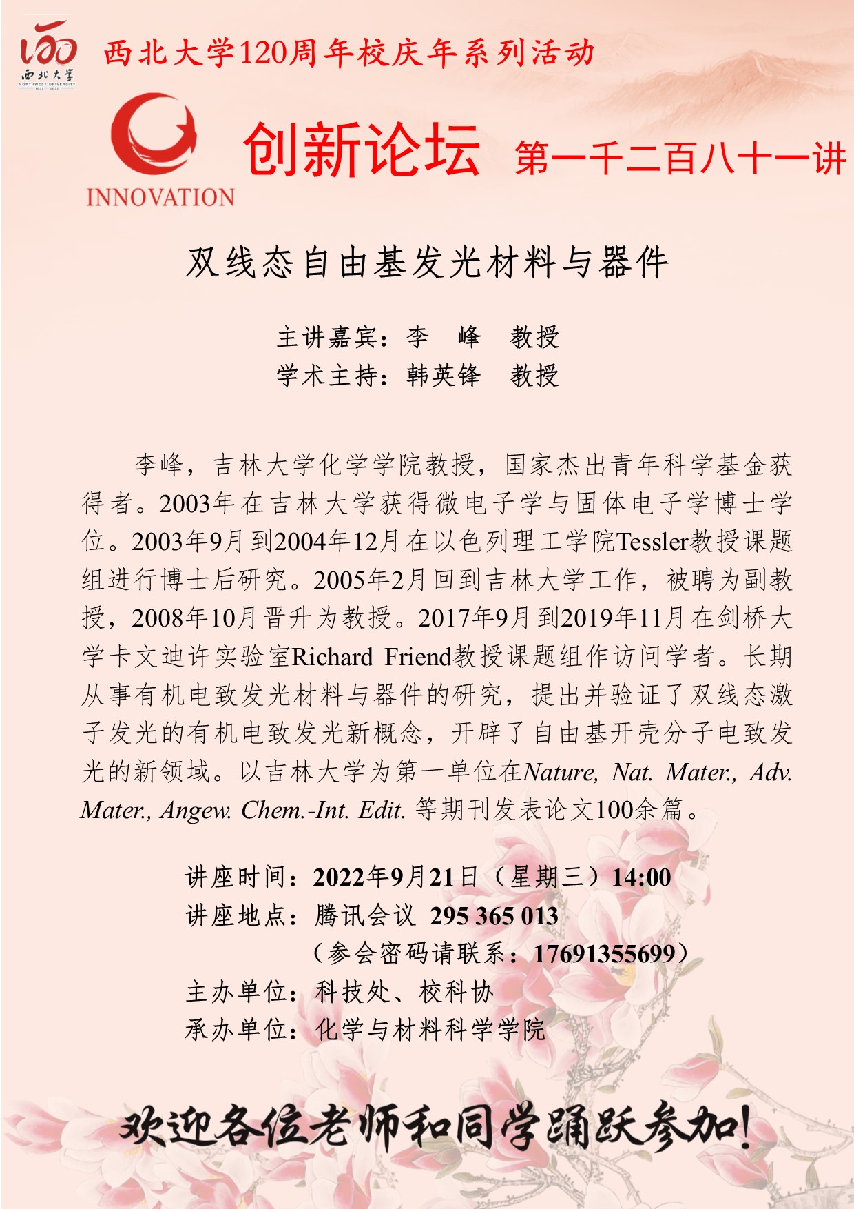 李峰 教授 必赢3003no1线路检测中心创新论坛第一千二百八十一讲暨120周年校庆年系列活动: 双线态自由基发光材料与器件 讲座时间 2022年9月21日(星期三) 14:00 讲座地点 腾讯会议ID:295 365 013 (参会密码请联系:17691355699) 讲座人介绍 李峰 教授 讲座内容