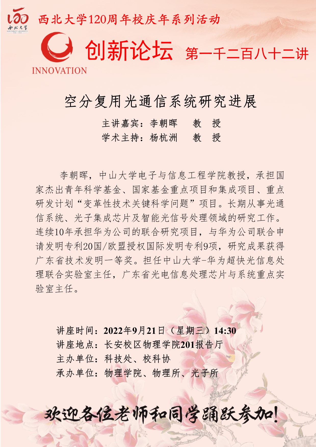 李朝晖 教授 必赢3003no1线路检测中心创新论坛第一千二百八十二讲暨120周年校庆年系列活动::空分复用光通信系统研究进展 讲座时间 2022年9月21日(星期三) 14:30 讲座地点 物理学院201报告厅 讲座人介绍 李朝晖 教授 讲座内容