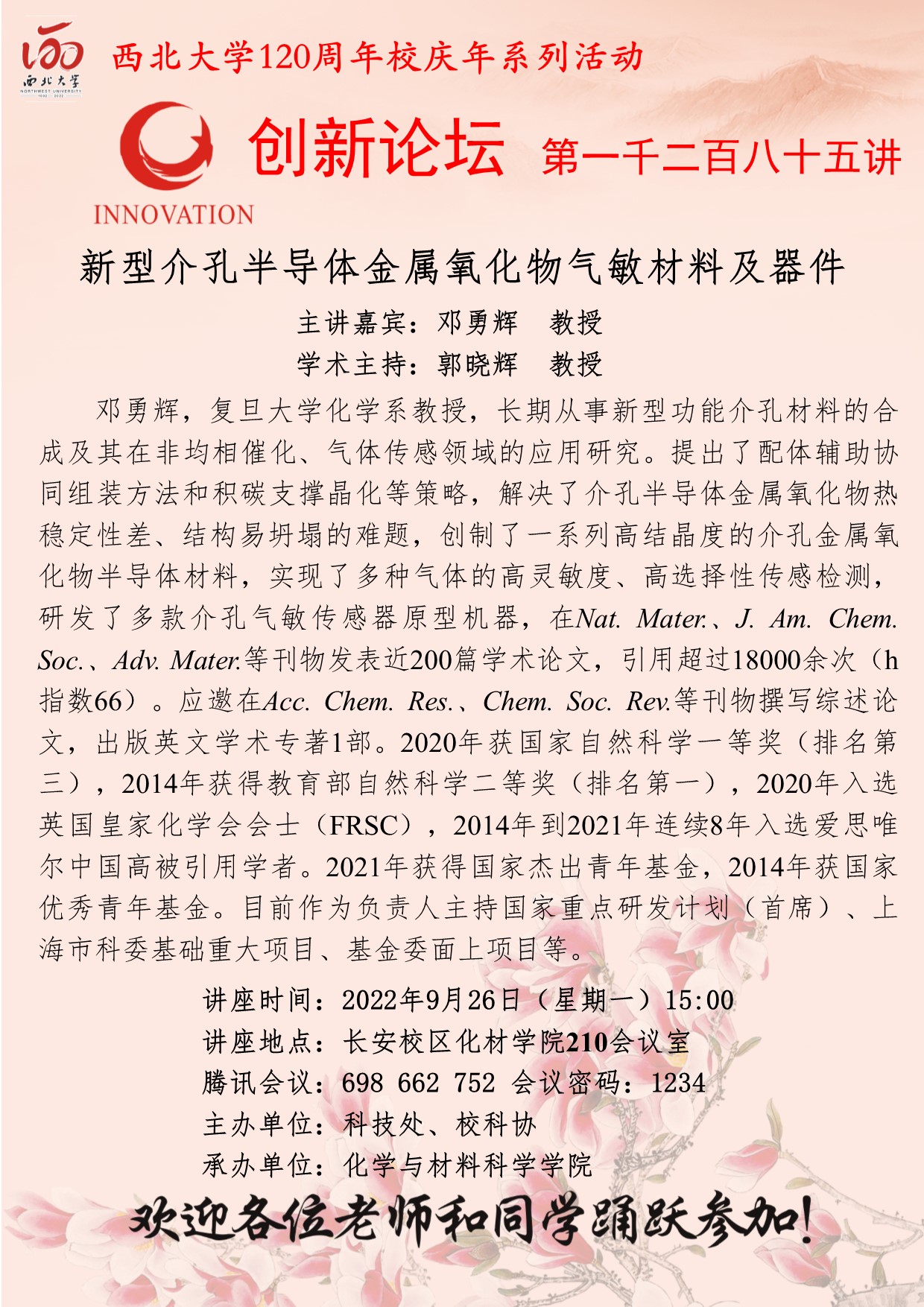 邓勇辉 教授 必赢3003no1线路检测中心创新论坛第一千二百八十五讲暨120周年校庆年系列活动::新型介孔半导体金属氧化物气敏材料及器件 讲座时间 2022年9月26日(星期一) 15:00 讲座地点 长安校区化材院210会议室(腾讯会议:698 662 752,会议密码:1234) 讲座人介绍 邓勇辉 教授 讲座内容