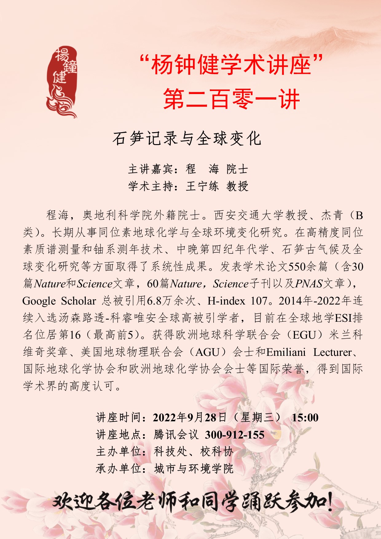 程 海 院士 “杨钟健学术讲座”第二百零一讲暨120周年校庆年系列活动:石笋记录与全球变化 讲座时间 2022年9月28日(星期三)15:00 讲座地点 腾讯会议 300-912-155 讲座人介绍 程 海 院士 讲座内容