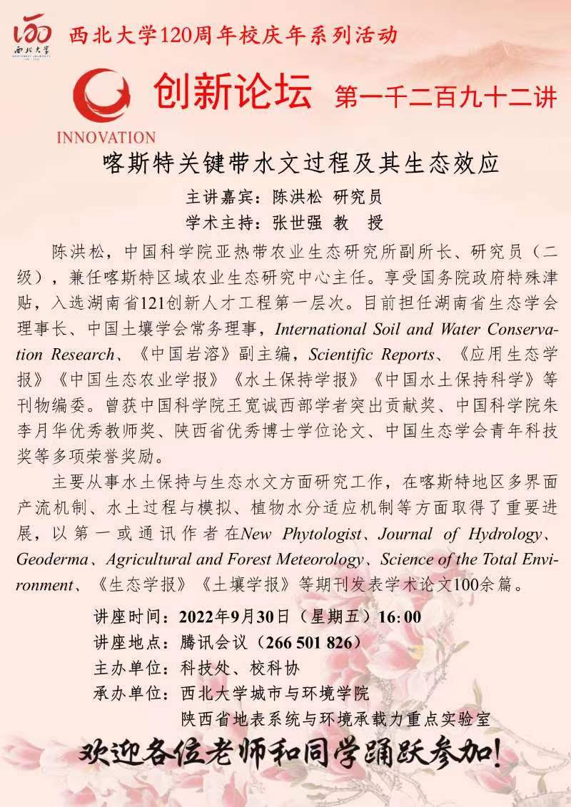 陈洪松 教授 必赢3003no1线路检测中心创新论坛第一千二百九十二讲暨120周年校庆年系列活动: 喀斯特关键带水文过程及其生态效应 讲座时间 2022年9月30日(星期五) 16:00 讲座地点 腾讯会议 266 501 826 讲座人介绍 陈洪松 教授 讲座内容
