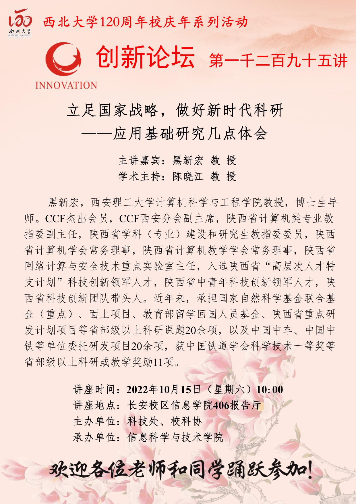 黑新宏 教授 必赢3003no1线路检测中心创新论坛第一千二百九十五讲暨120周年校庆年系列活动: 立足国家战略,做好新时代科研——应用基础研究几点体会 讲座时间 2022年10月15日(星期六)10:00 讲座地点 长安校区信息学院406报告厅 讲座人介绍 黑新宏 教授 讲座内容