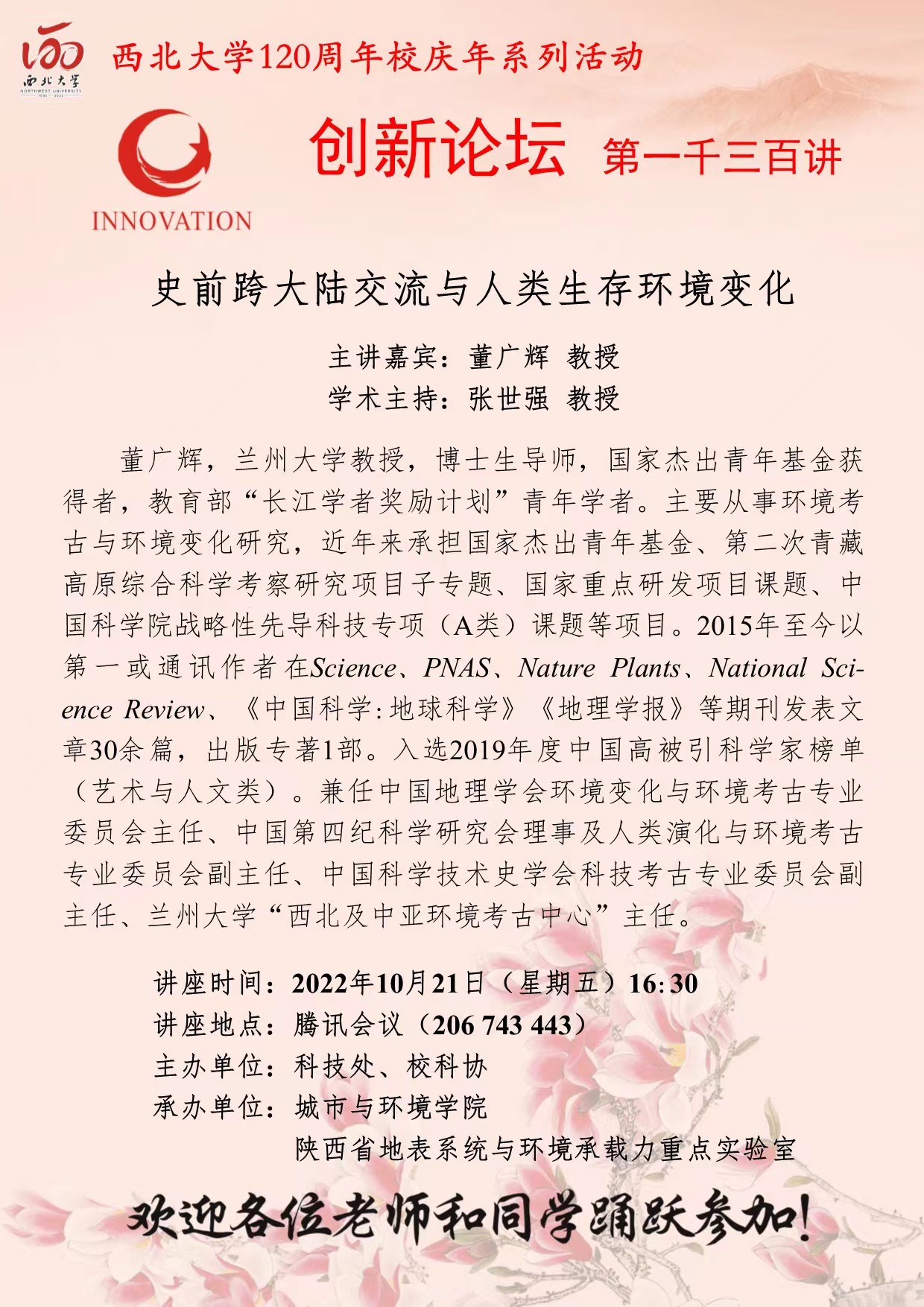 董广辉 教授 必赢3003no1线路检测中心创新论坛第一千三百讲暨120周年校庆年系列活动: 史前跨大陆交流与人类生存环境变化 讲座时间 2022年10月21日(星期五)16:30 讲座地点 腾讯会议 206 743 443 讲座人介绍 董广辉 教授 讲座内容