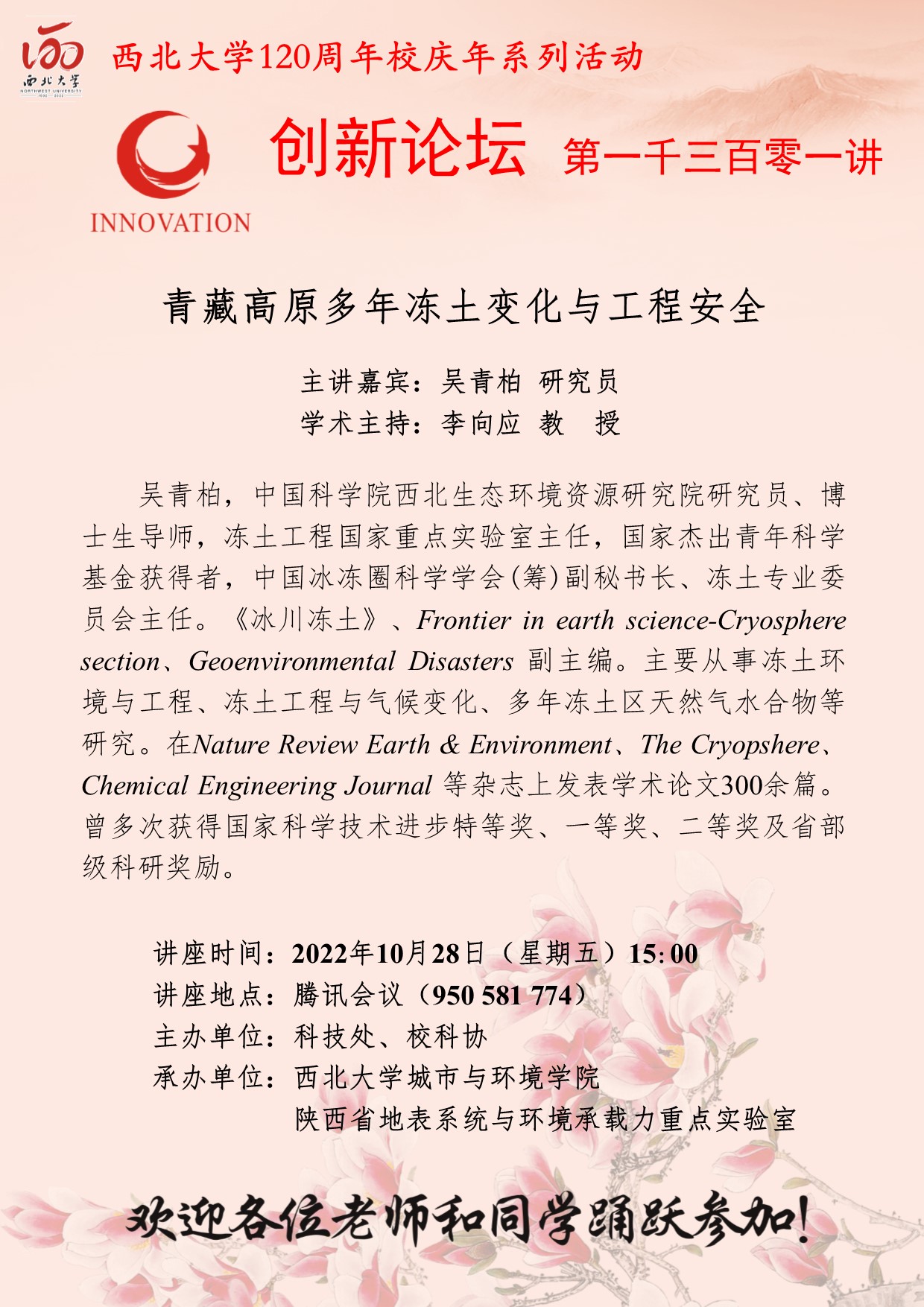 吴青柏 研究员 必赢3003no1线路检测中心创新论坛第一千三百零一讲暨120周年校庆年系列活动: 青藏高原多年冻土变化与工程安全 讲座时间 2022年10月28日(星期五)15:00 讲座地点 腾讯会议 950 581 774 讲座人介绍 吴青柏 研究员 讲座内容