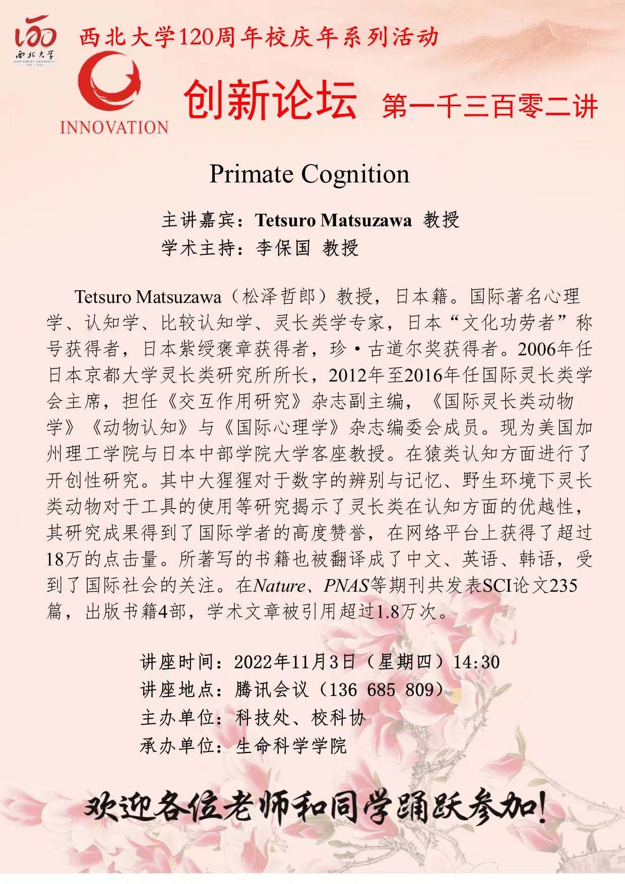 Tetsuro Matsuzawa 教授 必赢3003no1线路检测中心创新论坛第一千三百零二讲暨120周年校庆年系列活动: Primate Cognition 讲座时间 2022年11月3日(星期四)14:30 讲座地点 腾讯会议 136 685 809 讲座人介绍 Tetsuro Matsuzawa 教授 讲座内容