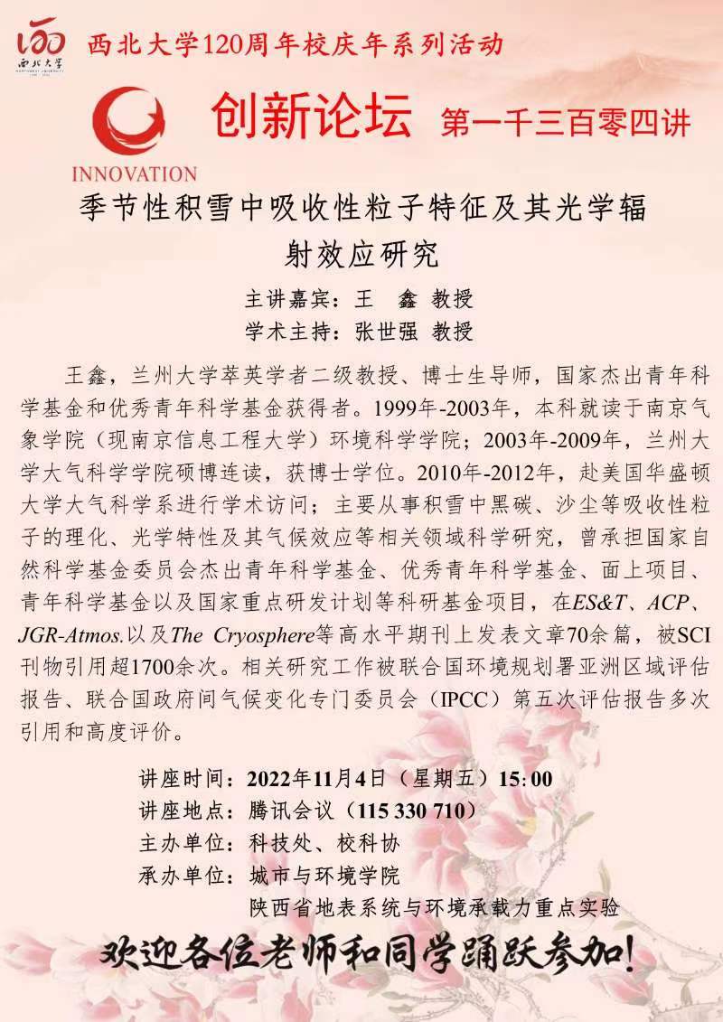 王 鑫 教授 必赢3003no1线路检测中心创新论坛第一千三百零四讲暨120周年校庆年系列活动: 季节性积雪中吸收性粒子特征及其光学辐射效应研究 讲座时间 2022年11月4日(星期五)15:00 讲座地点 腾讯会议 115 330 710 讲座人介绍 王 鑫 教授 讲座内容