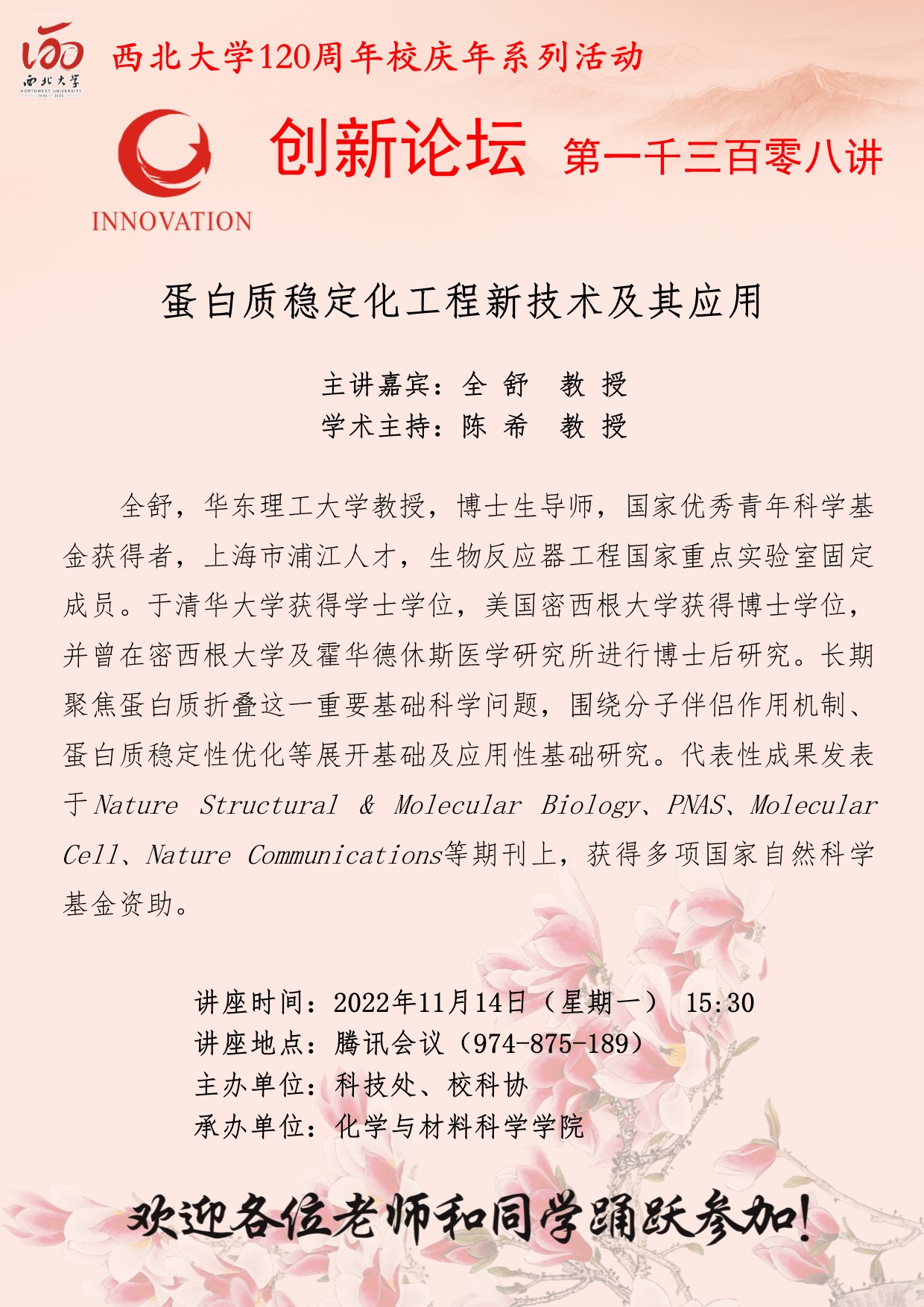 全舒 教授 必赢3003no1线路检测中心创新论坛第一千三百零八讲暨120周年校庆年系列活动: 蛋白质稳定化工程新技术及其应用 讲座时间 2022年11月14日(星期一)15:30 讲座地点 腾讯会议(974 875 189) 讲座人介绍 全舒 教授 讲座内容