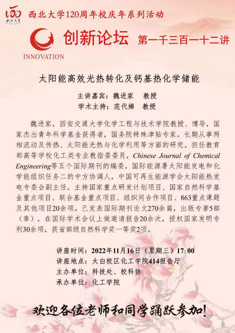 魏进家 教授 必赢3003no1线路检测中心创新论坛第一千三百一十二讲暨120周年校庆年系列活动:太阳能高效光热转化及钙基热化学储能 讲座时间 2022年11月16日(星期三)17:00 讲座地点 太白校区化工学院414报告厅 讲座人介绍 魏进家 教授 讲座内容