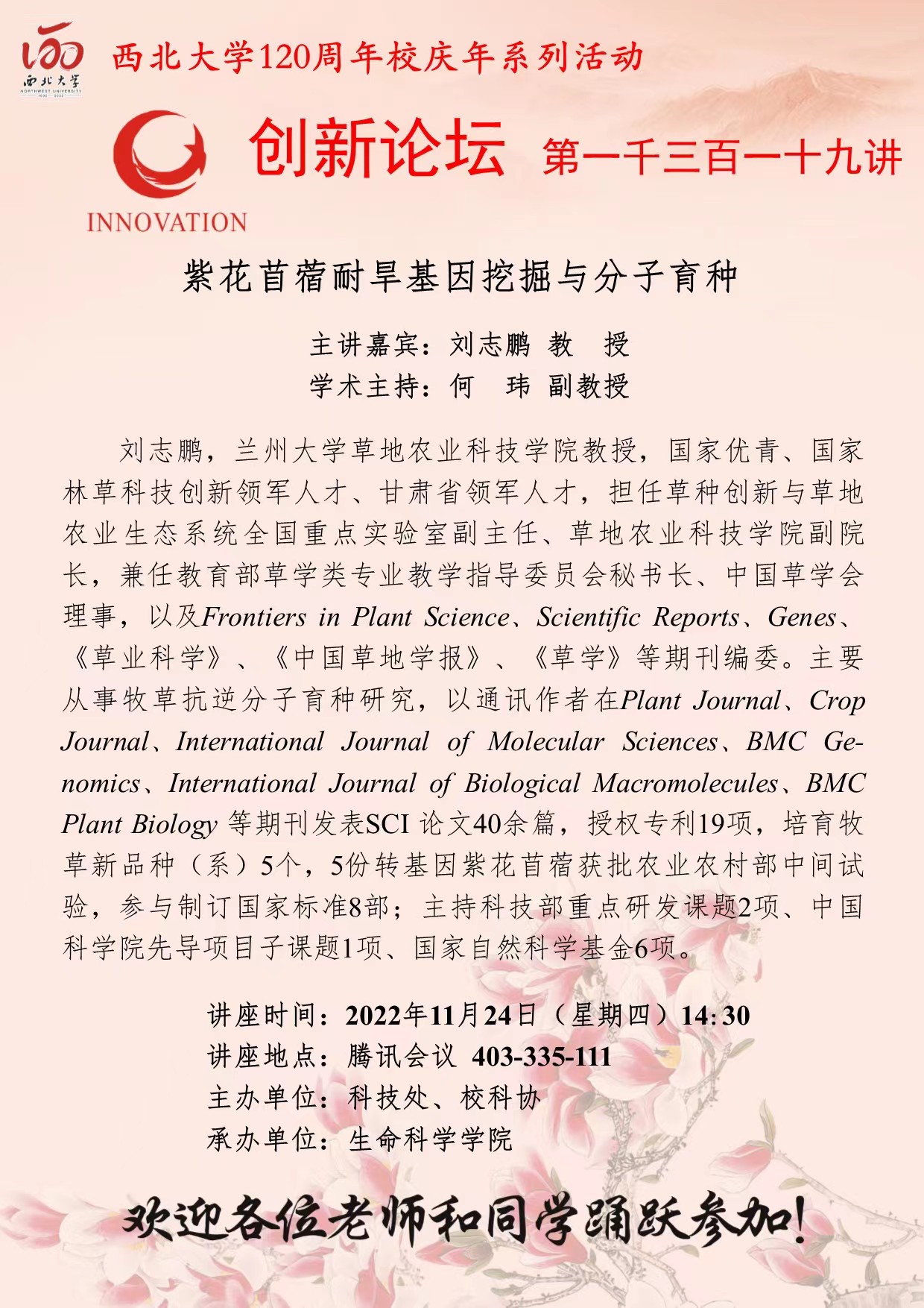 刘志鹏 教授 必赢3003no1线路检测中心创新论坛第一千三百一十九讲暨120周年校庆年系列活动: 紫花苜蓿耐旱基因挖掘与分子育种 讲座时间 2022年11月24日(星期四) 14:30 讲座地点 腾讯会议403-335-111 讲座人介绍 刘志鹏 教授 讲座内容