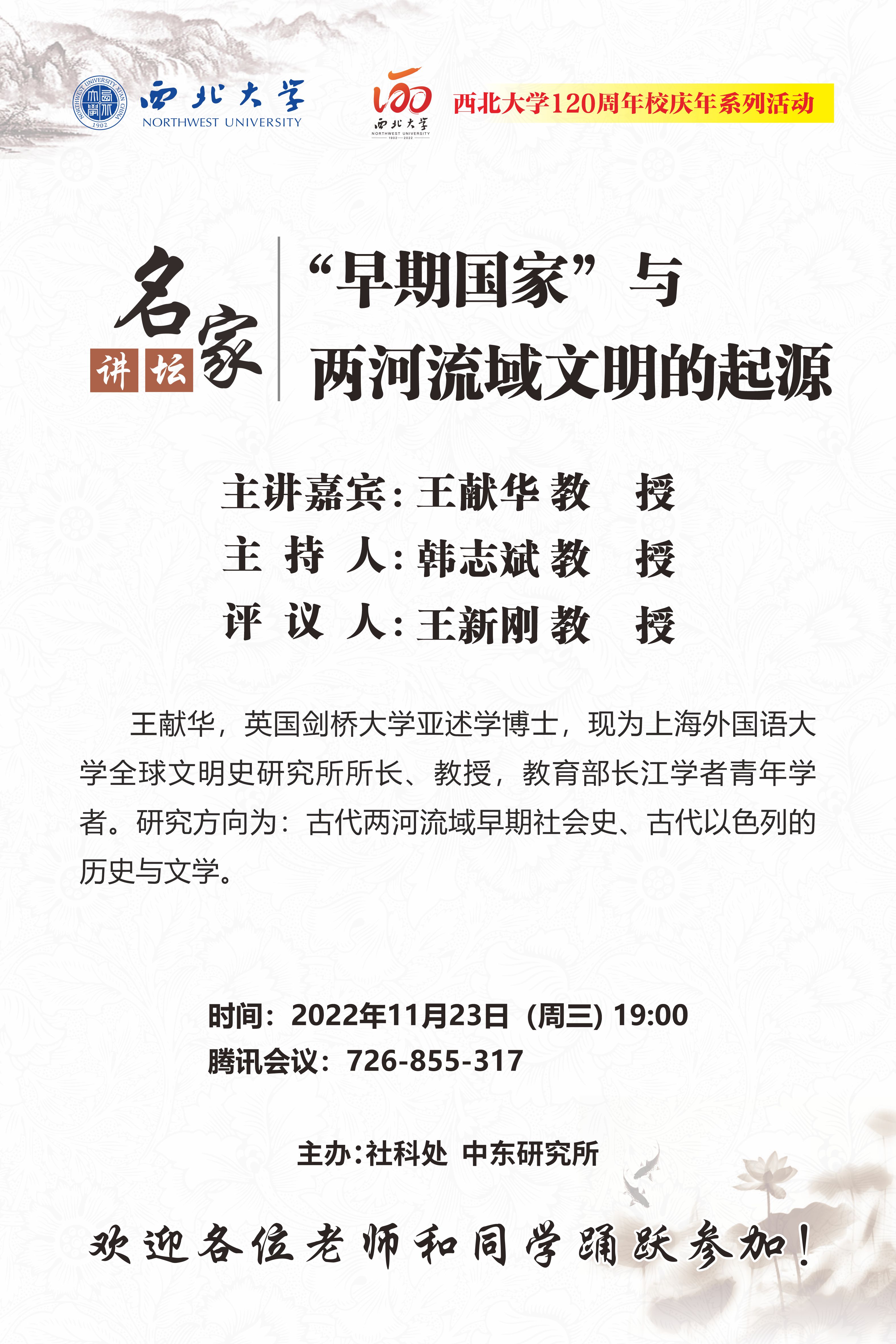 王献华 教授 名家讲坛暨120周年校庆年系列活动:“早期国家”与两河流域文明的起源 讲座时间 2022年11月23日(周三)19:00 讲座地点 腾讯会议:726-855-317 讲座人介绍 王献华 教授 讲座内容