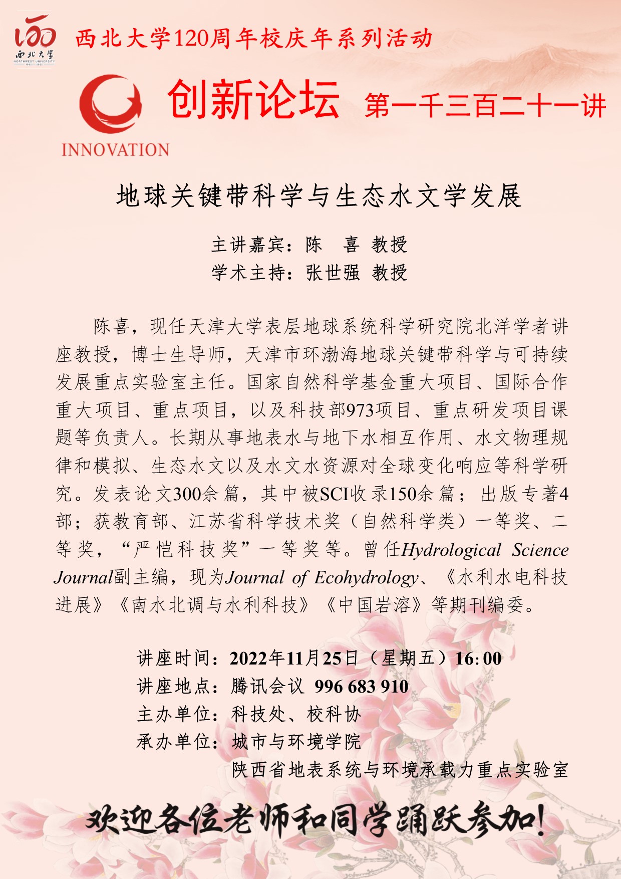 陈喜 教授 必赢3003no1线路检测中心创新论坛第一千三百二十一讲暨120周年校庆年系列活动:地球关键带科学与生态水文学发展 讲座时间 2022年11月25日(星期五)16:00 讲座地点 腾讯会议 996 683 910 讲座人介绍 陈喜 教授 讲座内容