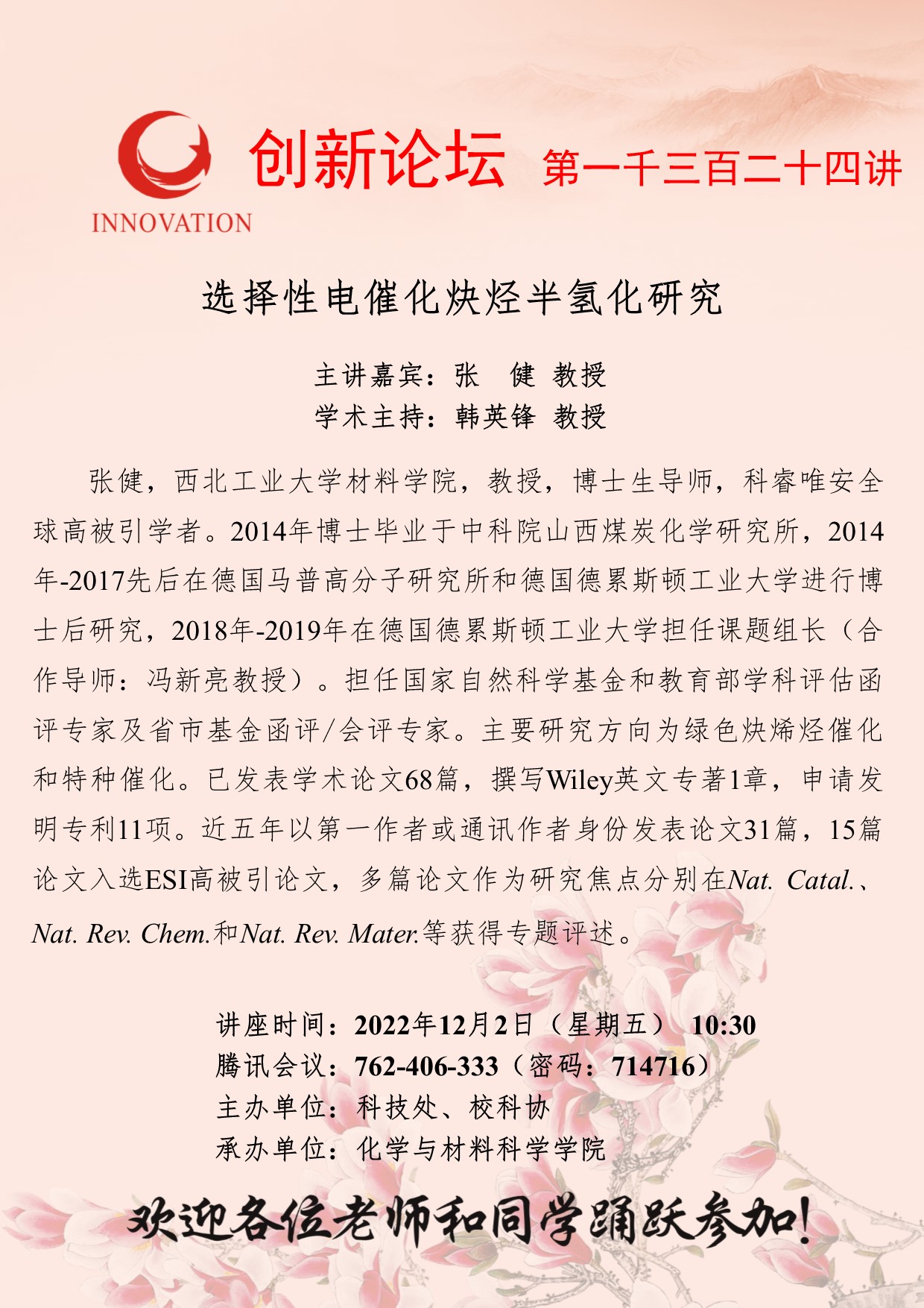 张 健 教授 必赢3003no1线路检测中心创新论坛第一千三百二十四讲:选择性电催化炔烃半氢化研究 讲座时间 2022年12月2日(星期五) 10:30 讲座地点 腾讯会议762-406-333(密码:714716) 讲座人介绍 张 健 教授 讲座内容
