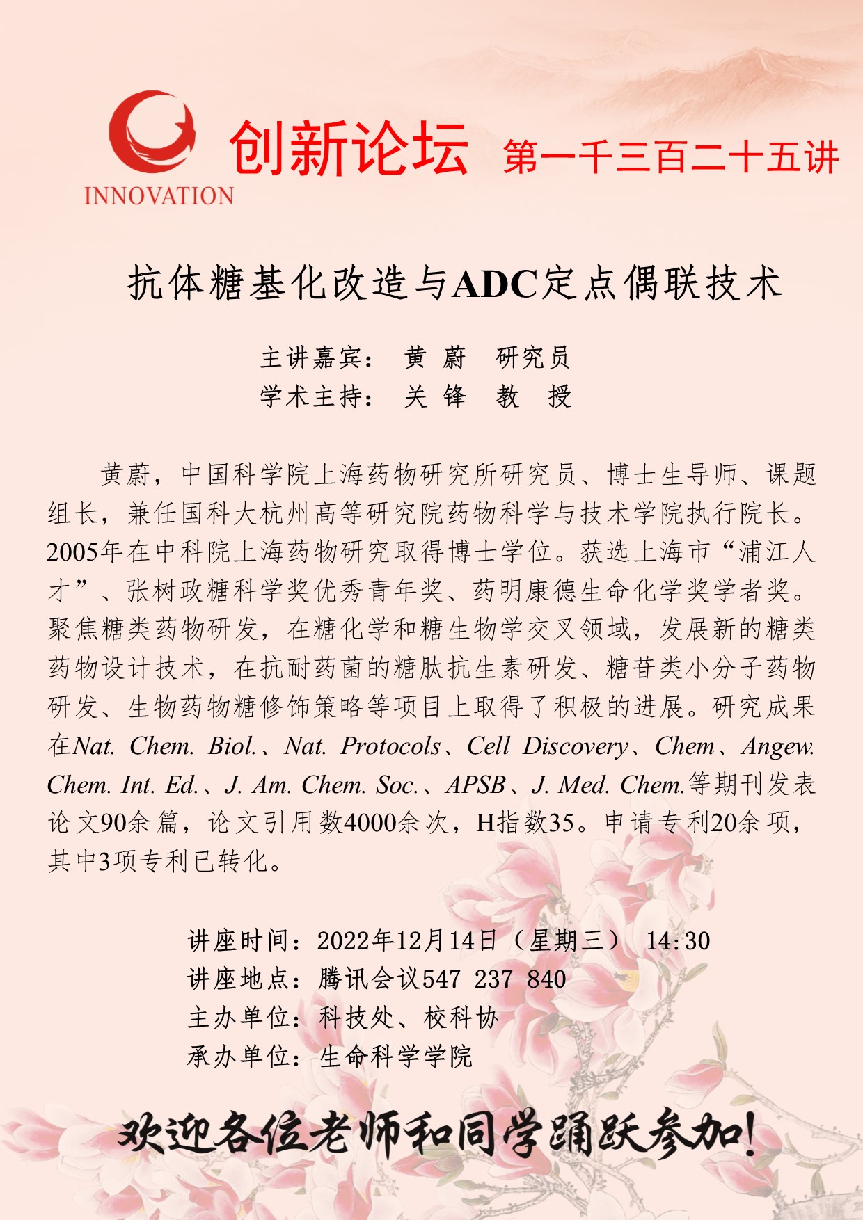 黄蔚 研究员 必赢3003no1线路检测中心创新论坛第一千三百二十五讲:抗体糖基化改造与ADC定点偶联技术 讲座时间 2022年12月14日(星期三) 14:30 讲座地点 腾讯会议547 237 840 讲座人介绍 黄蔚 研究员 讲座内容