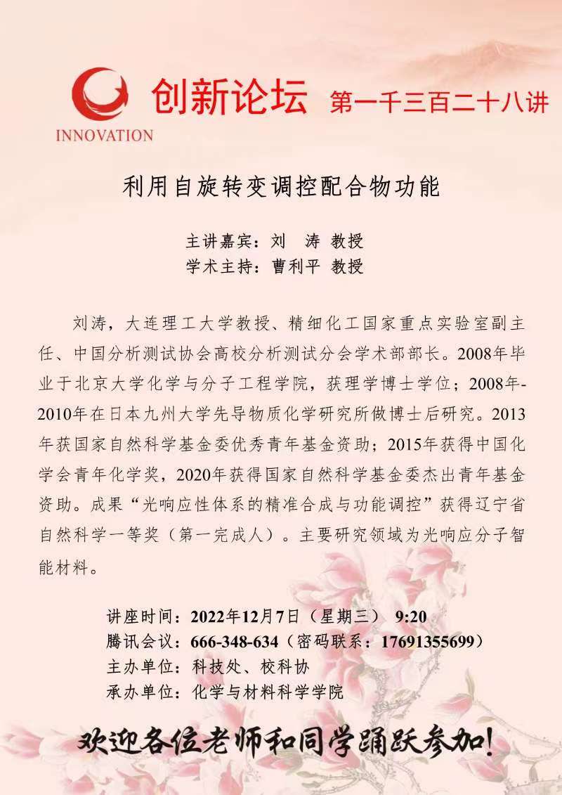 刘涛 教授 必赢3003no1线路检测中心创新论坛第一千三百二十八讲:利用自旋转变调控配合物功能 讲座时间 2022年12月7日(星期三) 9:20 讲座地点 腾讯会议:666-348-634 讲座人介绍 刘涛 教授 讲座内容