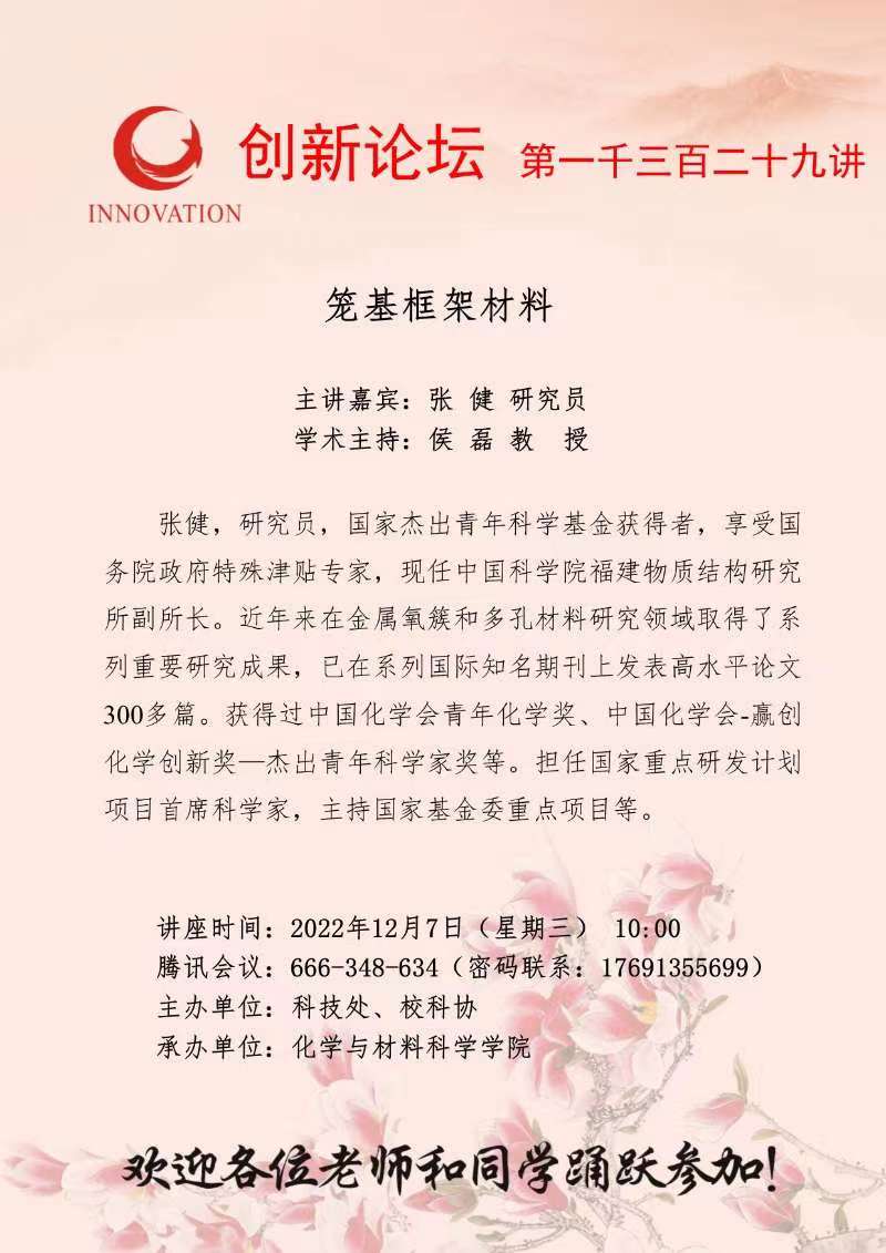 张健 研究员 必赢3003no1线路检测中心创新论坛第一千三百二十九讲:笼基框架材料 讲座时间 2022年12月7日(星期三) 10:00 讲座地点 腾讯会议:666-348-634 讲座人介绍 张健 研究员 讲座内容
