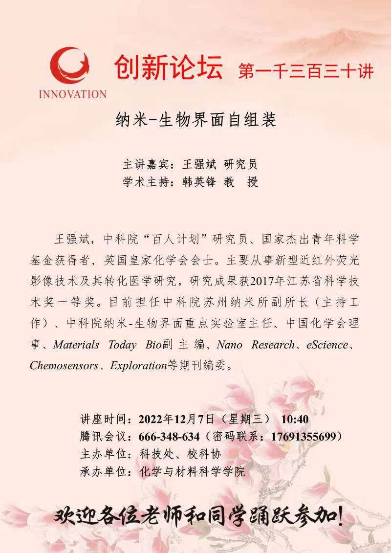 王强斌 研究员 必赢3003no1线路检测中心创新论坛第一千三百三十讲:纳米-生物界面自组装 讲座时间 2022年12月7日(星期三) 10:40 讲座地点 腾讯会议:666-348-634 讲座人介绍 王强斌 研究员 讲座内容