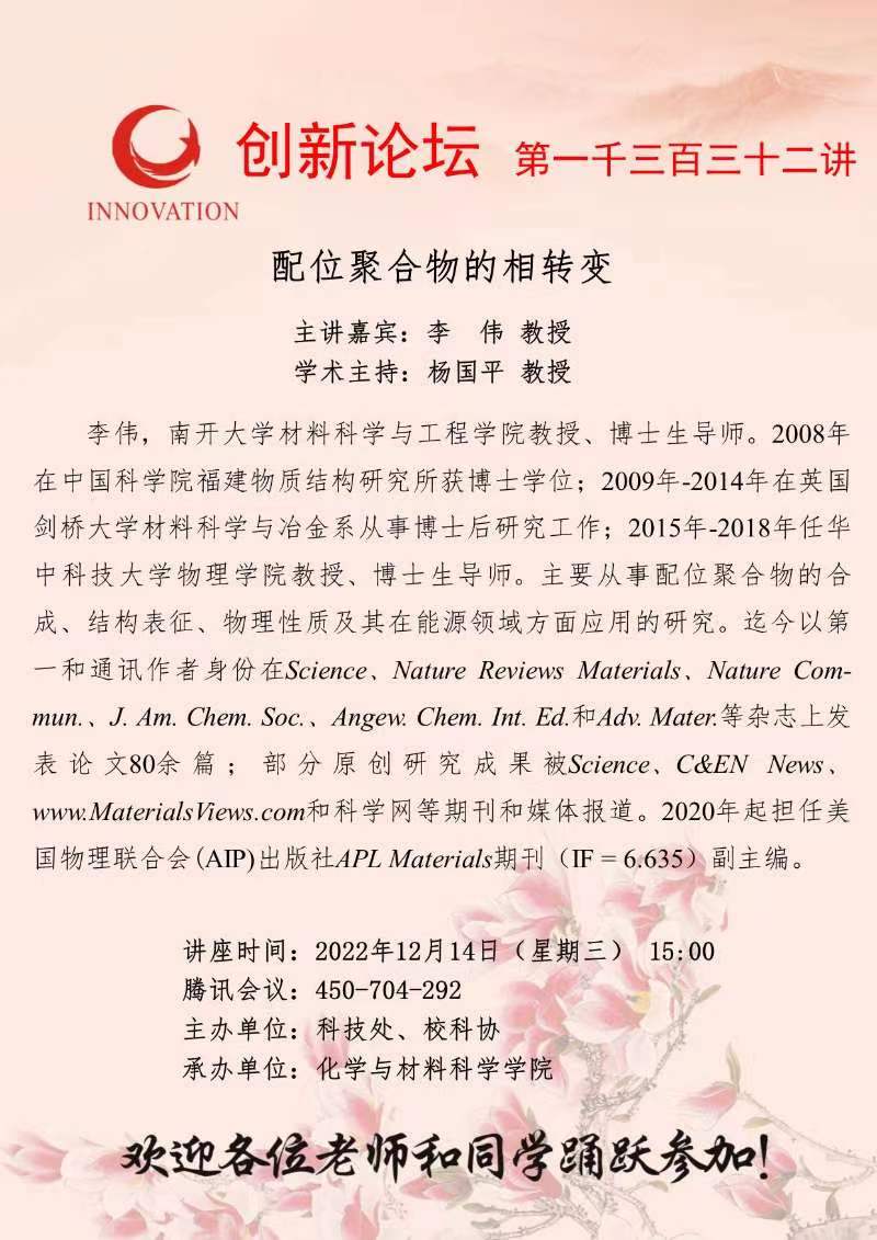 李伟 教授 必赢3003no1线路检测中心创新论坛第一千三百三十二讲:配位聚合物的相转变 讲座时间 2022年12月14日(星期三) 15:00 讲座地点 腾讯会议:450-704-292 讲座人介绍 李伟 教授 讲座内容