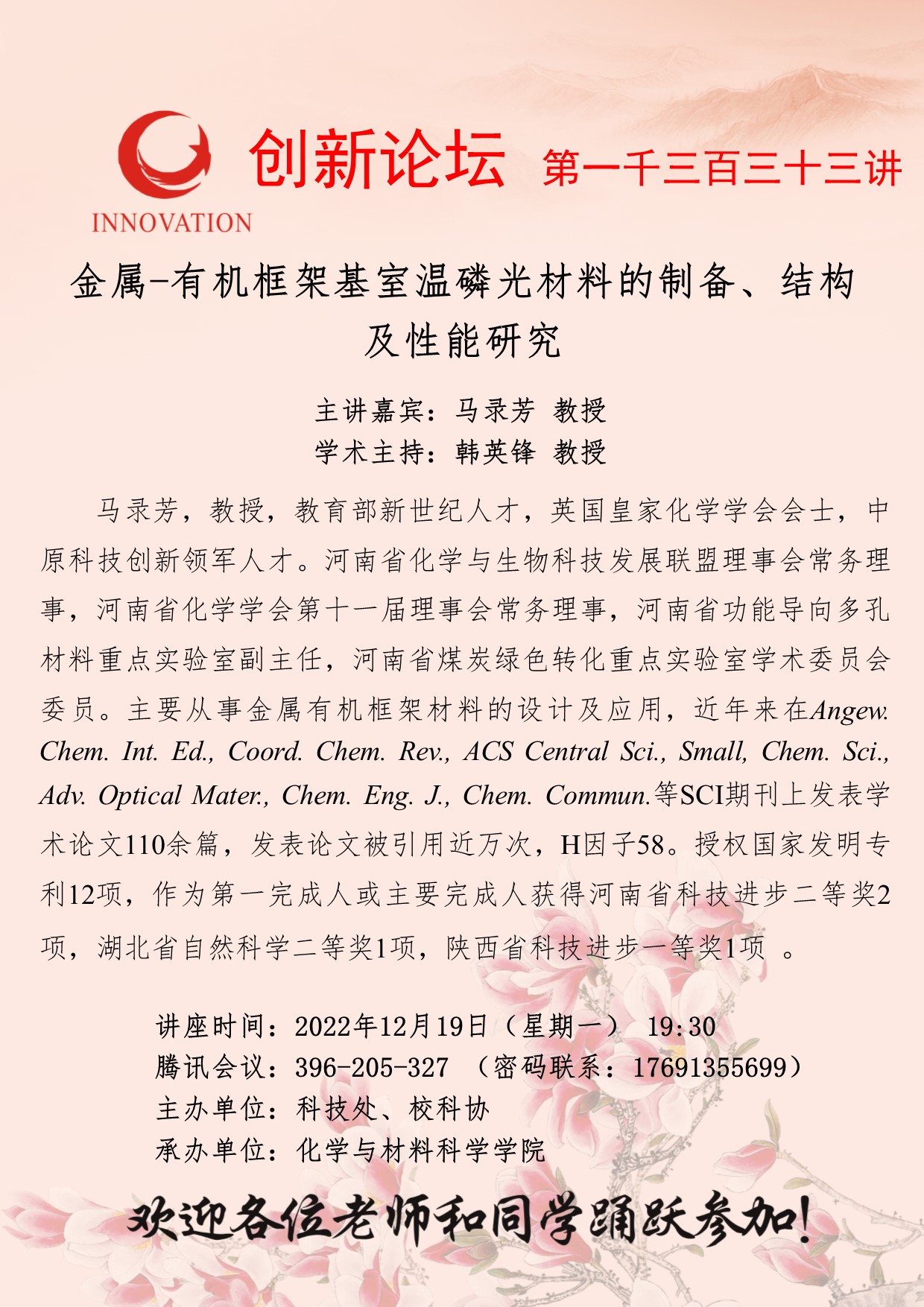 马录芳 教授 必赢3003no1线路检测中心创新论坛第一千三百三十三讲:金属-有机框架基室温磷光材料的制备、结构及性能研究 讲座时间 2022年12月19日(星期一) 19:30 讲座地点 腾讯会议:396-205-327 讲座人介绍 马录芳 教授 讲座内容