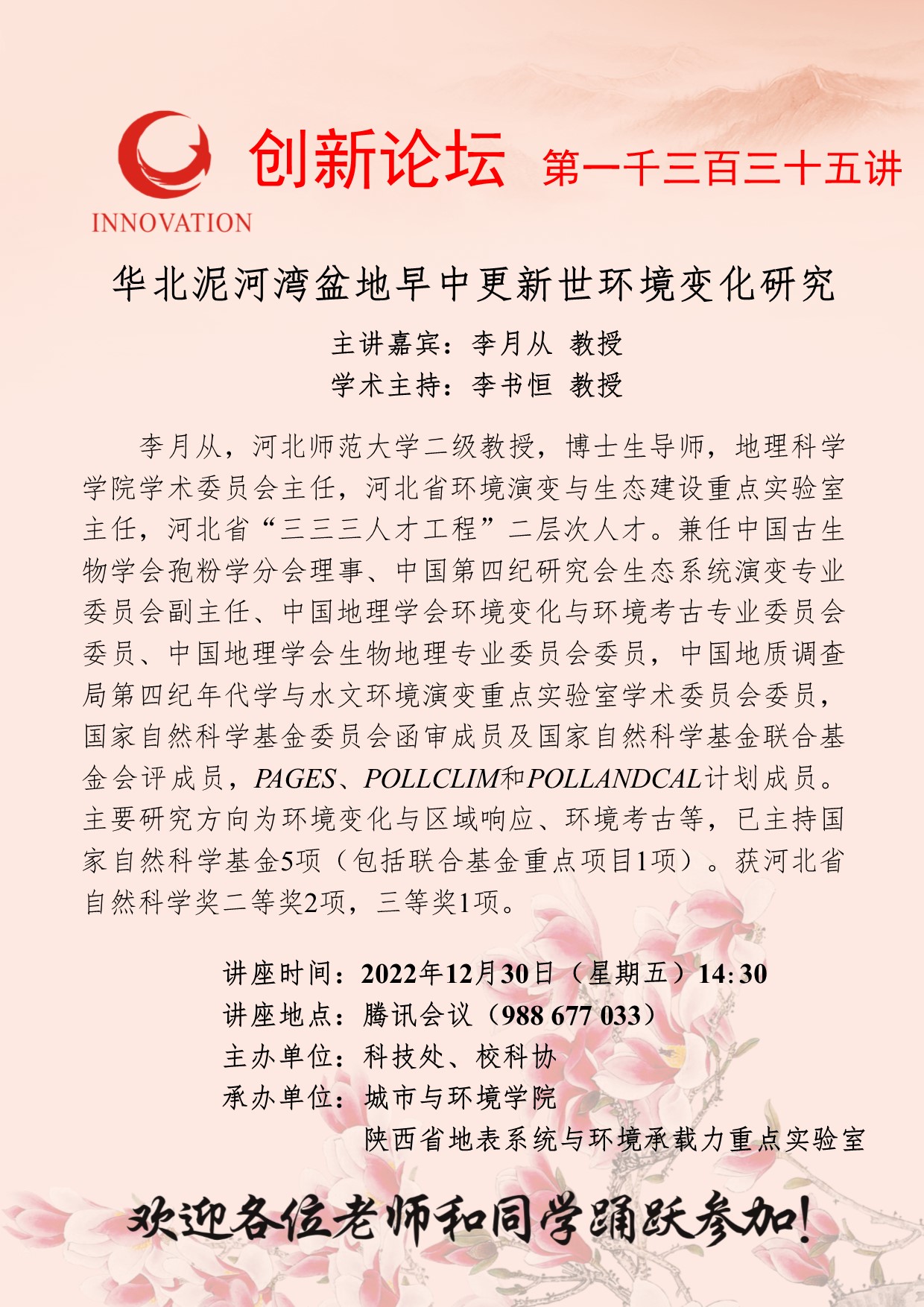 李月从 教授 必赢3003no1线路检测中心创新论坛第一千三百三十五讲:华北泥河湾盆地早中更新世环境变化研究 讲座时间 2022年12月30日(星期五)14:30 讲座地点 腾讯会议(988 677 033) 讲座人介绍 李月从 教授 讲座内容