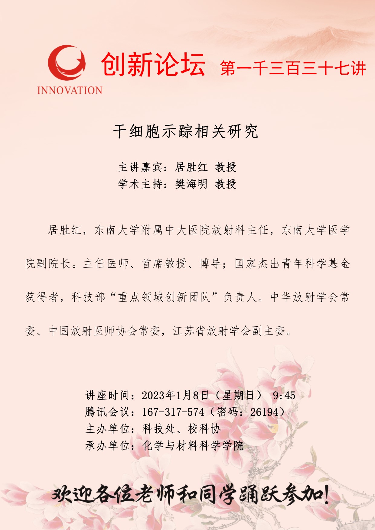 居胜红 教授 必赢3003no1线路检测中心创新论坛第一千三百三十七讲:干细胞示踪相关研究 讲座时间 2023年1月8日(星期日) 9:45 讲座地点 腾讯会议:167-317-574 讲座人介绍 居胜红 教授 讲座内容