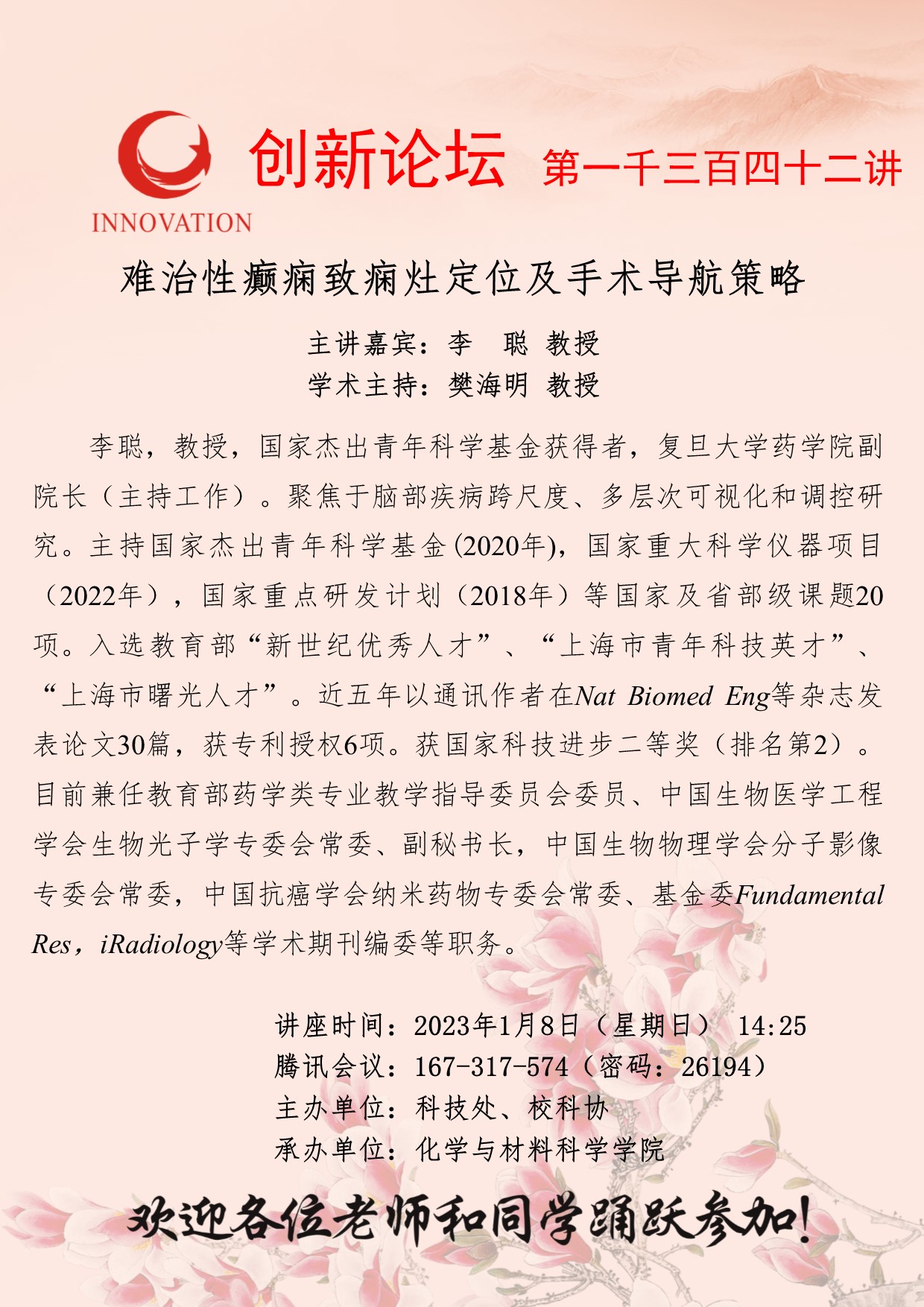 李聪 教授 必赢3003no1线路检测中心创新论坛第一千三百四十二讲:难治性癫痫致痫灶定位及手术导航策略 讲座时间 2023年1月8日(星期日) 14:25 讲座地点 腾讯会议:167-317-574 讲座人介绍 李聪 教授 讲座内容