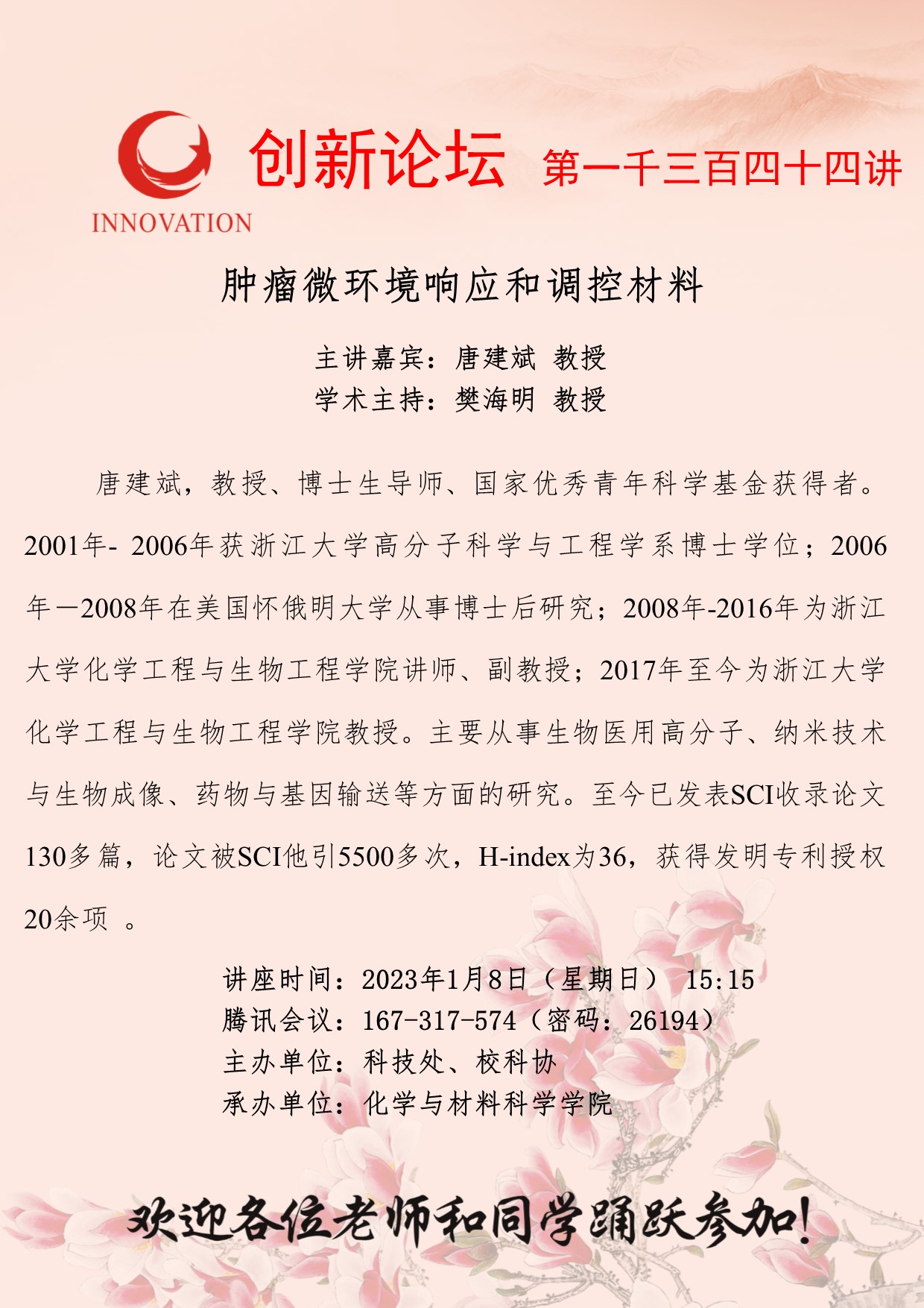 唐建斌 教授 必赢3003no1线路检测中心创新论坛第一千三百四十四讲:肿瘤微环境响应和调控材料 讲座时间 2023年1月8日(星期日) 15:15 讲座地点 腾讯会议:167-317-574 讲座人介绍 唐建斌 教授 讲座内容