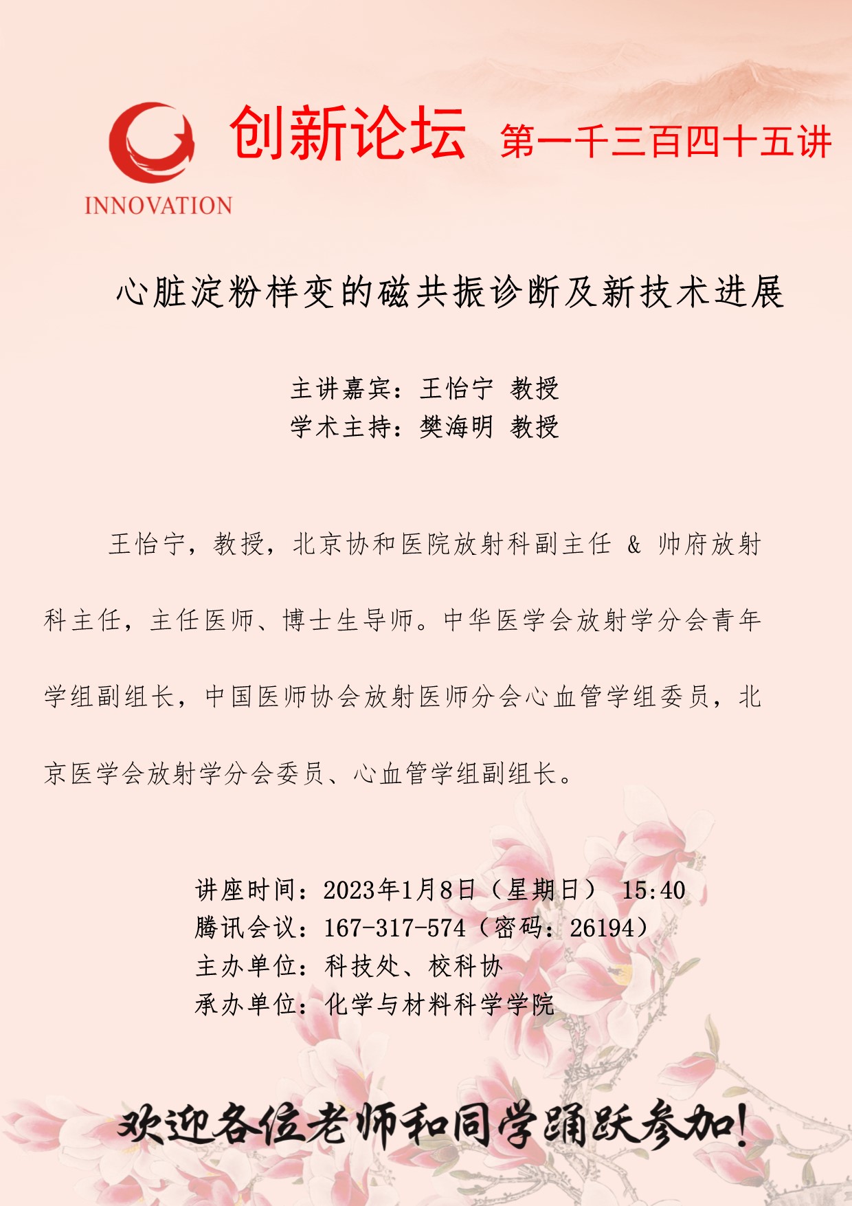 王怡宁 教授 必赢3003no1线路检测中心创新论坛第一千三百四十五讲:心脏淀粉样变的磁共振诊断及新技术进展 讲座时间 2023年1月8日(星期日) 15:40 讲座地点 腾讯会议:167-317-574 讲座人介绍 王怡宁 教授 讲座内容