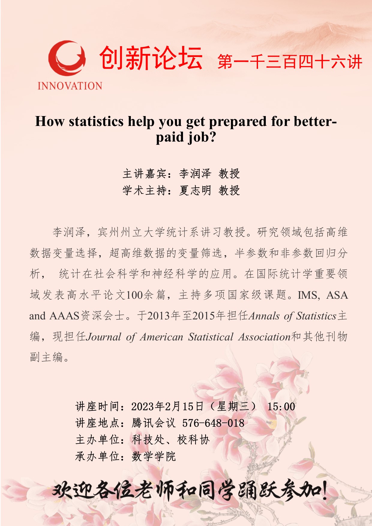 李润泽 教授 必赢3003no1线路检测中心创新论坛第一千三百四十六讲:How statistics help you get prepared for better-paid job? 讲座时间 2023年2月15日(星期三) 15:00 讲座地点 腾讯会议 576-648-018 讲座人介绍 李润泽 教授 讲座内容