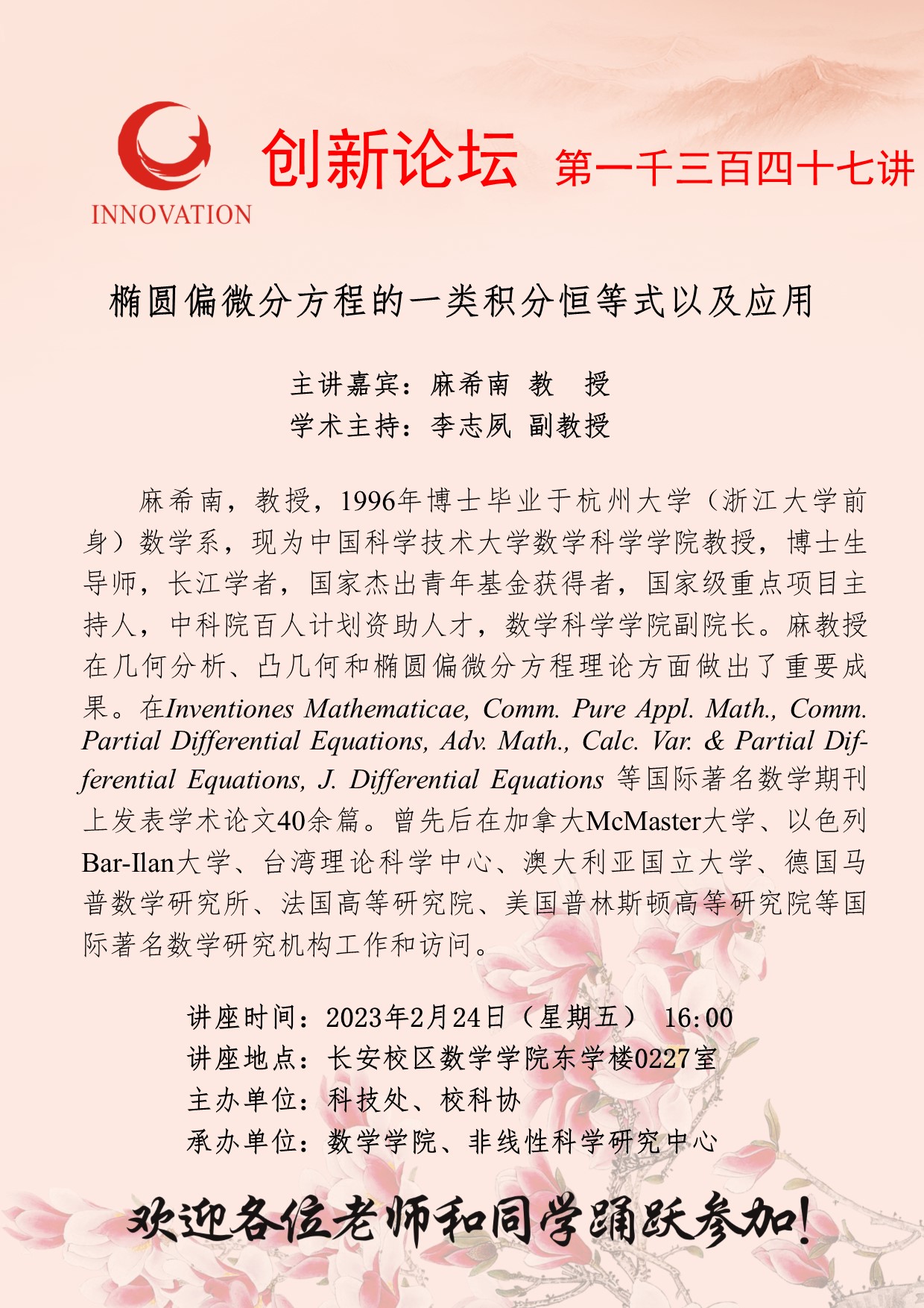 麻希南 教授 必赢3003no1线路检测中心创新论坛第一千三百四十七讲: 椭圆偏微分方程的一类积分恒等式以及应用 讲座时间 2023年2月24日(星期五)16:00 讲座地点 长安校区数学学院东学楼0227室 讲座人介绍 麻希南 教授 讲座内容