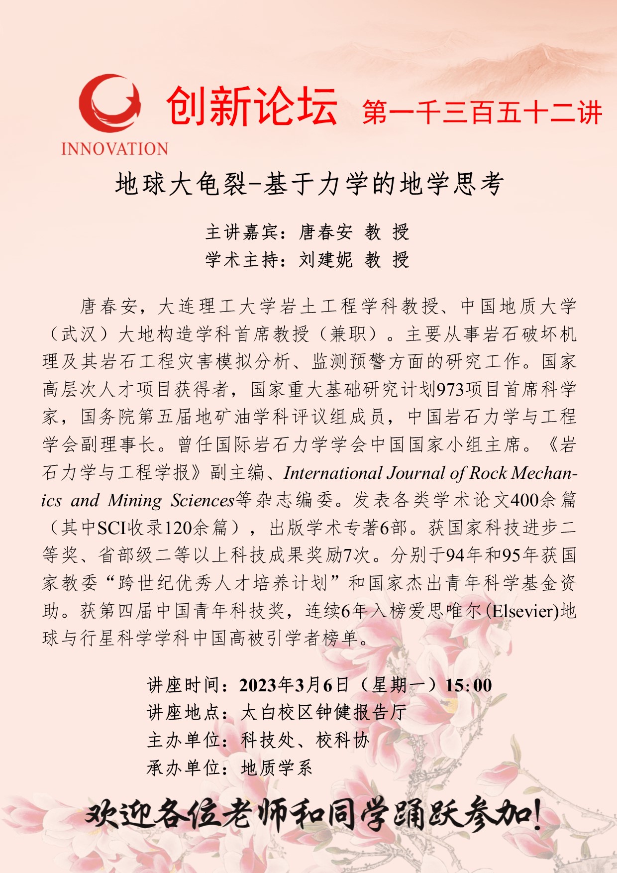 唐春安 教授 必赢3003no1线路检测中心创新论坛第一千三百五十二讲:地球大龟裂-基于力学的地学思考 讲座时间 2023年3月6日(星期一)15:00 讲座地点 太白校区钟健报告厅 讲座人介绍 唐春安 教授 讲座内容
