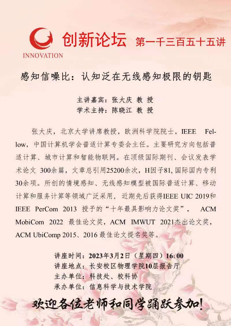 张大庆 教授 必赢3003no1线路检测中心创新论坛第一千三百五十五讲:感知信噪比:认知泛在无线感知极限的钥匙 讲座时间 2023年3月2日(星期四)16:00 讲座地点 长安校区物理学院10层报告厅 讲座人介绍 张大庆 教授 讲座内容